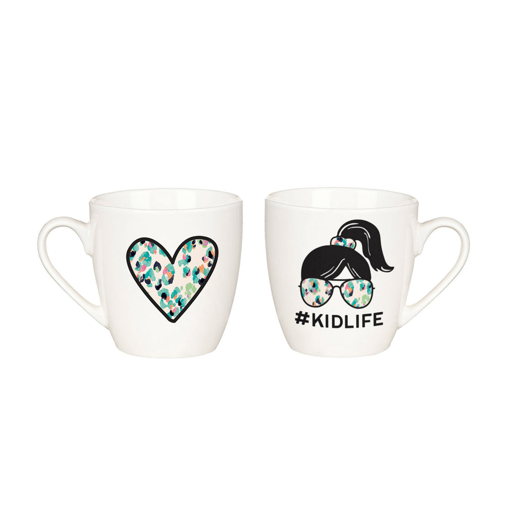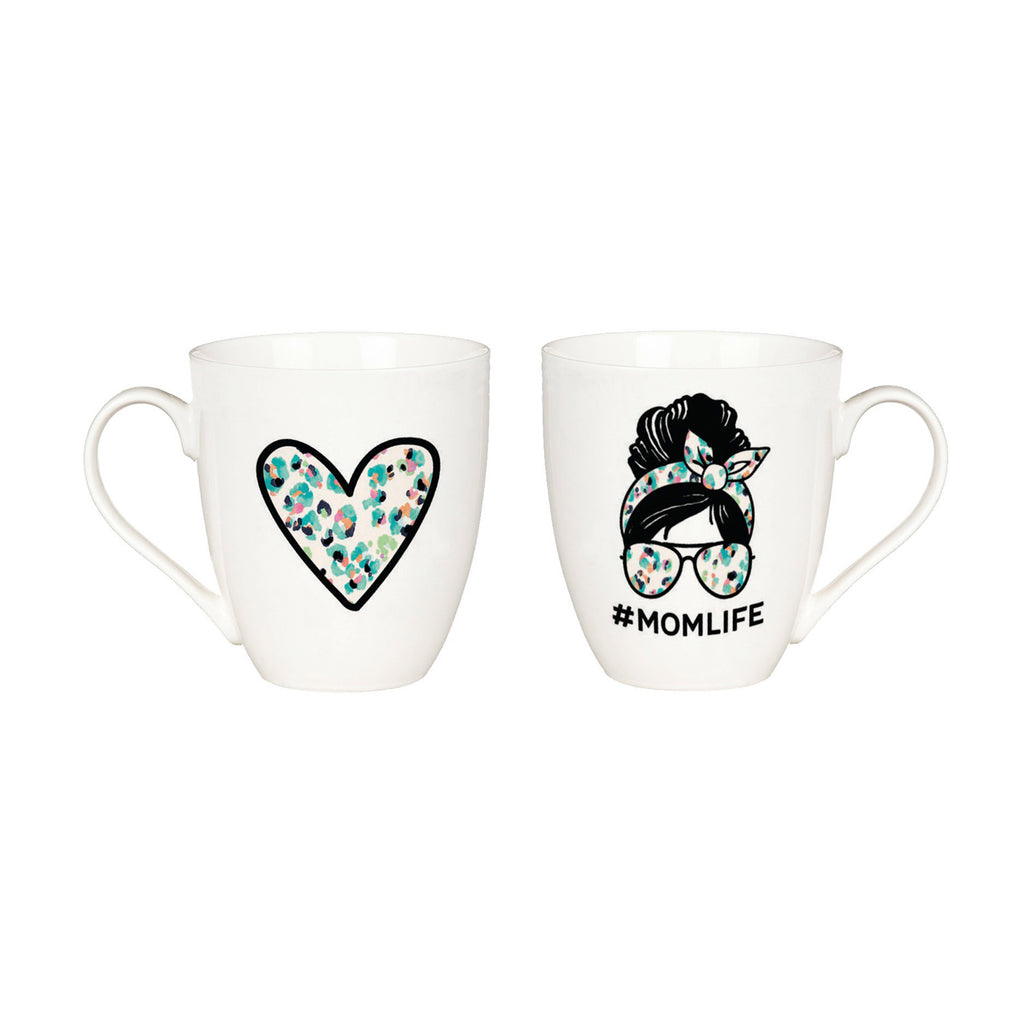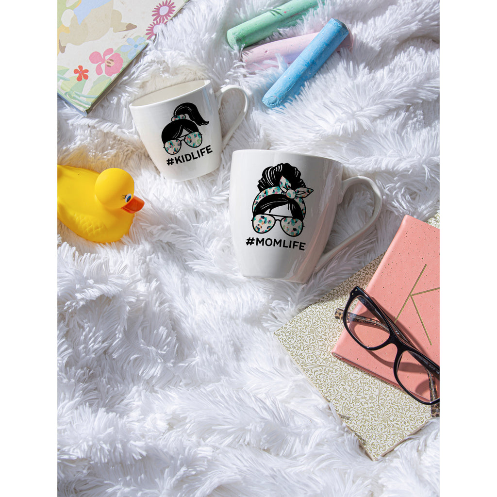 This charming Mommy and Me Ceramic Cup Gift Set features two playful cups, perfect for enjoying beverages together. Each cup is adorned with a #MOMLIFE or #KIDLIFE design, adding a fun and personal touch.