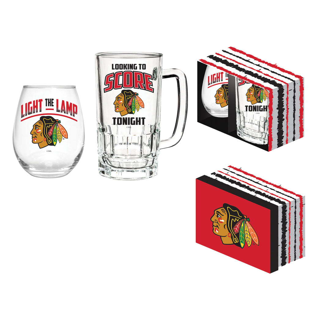 Celebrate your love for the Chicago Blackhawks with this elegant Stemless Glass and Tankard Gift Set, perfect for any fan's drinkware collection.