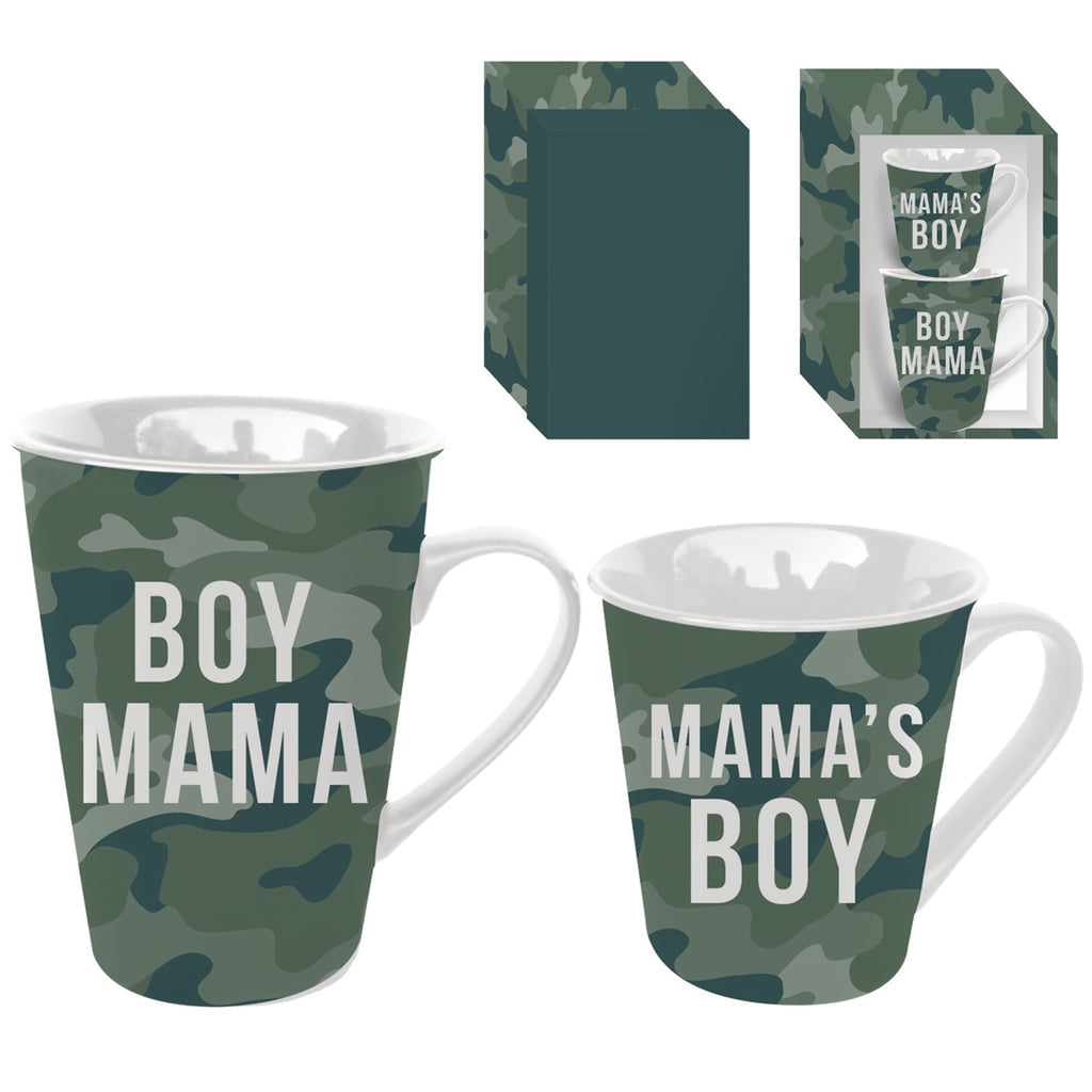 Celebrate the special bond between mother and son with this charming camo-themed ceramic cup gift set. Perfect for Mother's Day, the set includes two cups with playful 'Boy Mama' and 'Mama's Boy' designs.