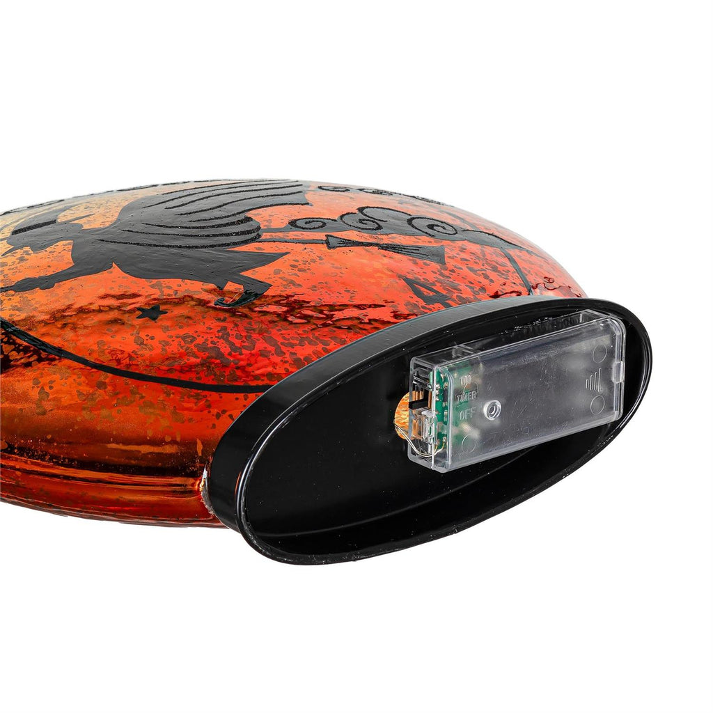 Illuminate your space with the enchanting Witch on Broom LED Crackle Glass Table Décor. Standing at 9.75 inches high, this captivating piece features a silhouette of a witch soaring across a moonlit sky. The crackle glass design adds a magical touch, casting mesmerizing patterns of light and shadow. Perfect for Halloween or anytime you want to add a mystical ambiance to your home, this LED table décor is sure to impress. Its compact size makes it a versatile addition to mantels, side tables, or entryways.