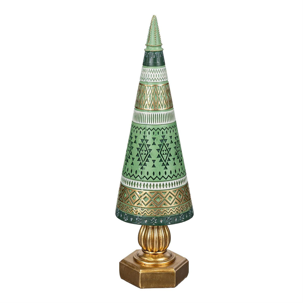 Elevate your holiday or everyday table setting with the Shades of Green Table Décor Tree Decorative Resin Set. Crafted from durable resin, these trees feature intricate geometric patterns in varying shades of green accented with gold detailing, adding a touch of elegance to any room. Measuring 3.5 inches in length and height and 12 inches in width, this set fits perfectly on mantels, tables, or shelves. The artistic design and rich colors make it ideal for seasonal displays or year-round decoration. Enhance your home’s aesthetic with this charming and versatile décor piece.