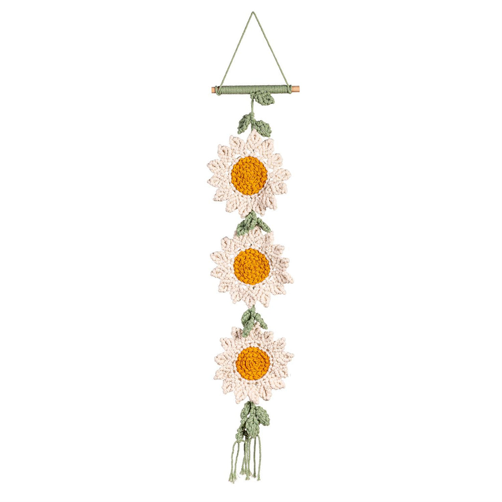 Brighten up any room with the charming Daisy Macrame Hanging Décor. This piece features three intricately crafted daisy motifs, each connected in a vertical arrangement. With its 31-inch length, this décor piece is perfect for adding a touch of nature to your living space, bedroom, or even a nursery. The soft, neutral tones of the daisies blend seamlessly with various color schemes, while the handcrafted macrame design adds a bohemian flair. Easy to hang, this delightful décor is sure to bring a smile to your face every time you see it.