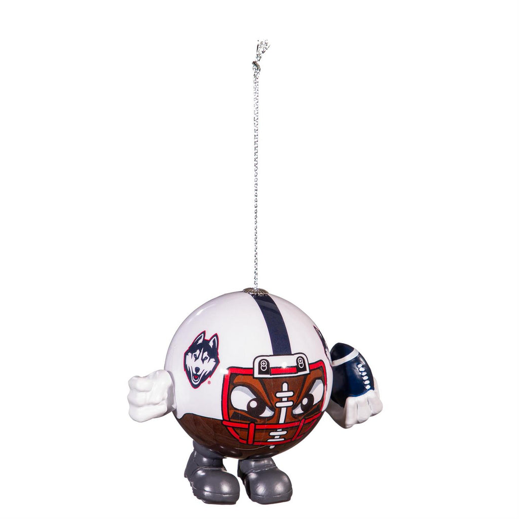 Celebrate your University of Connecticut pride with this vibrant ball head ornament. Perfect for fans and alumni, this unique piece adds a spirited touch to any holiday decor. Featuring a playful design with team colors and mascot details, it's a charming addition to your collection. Measuring 4.8 inches in length, 3.15 inches in width, and 3.82 inches in height, this ornament is easy to hang with its attached string. Whether displayed on a tree or as part of a sports-themed collection, it’s a great way to show off your Husky spirit.