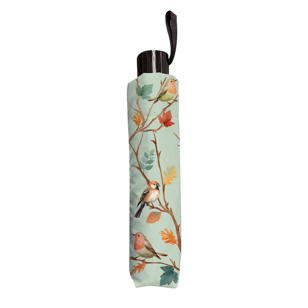 The Autumn Twilight Birds Compact Manual Umbrella features a charming fall design with colorful birds and leaves, perfect for fashion-forward protection against the rain.