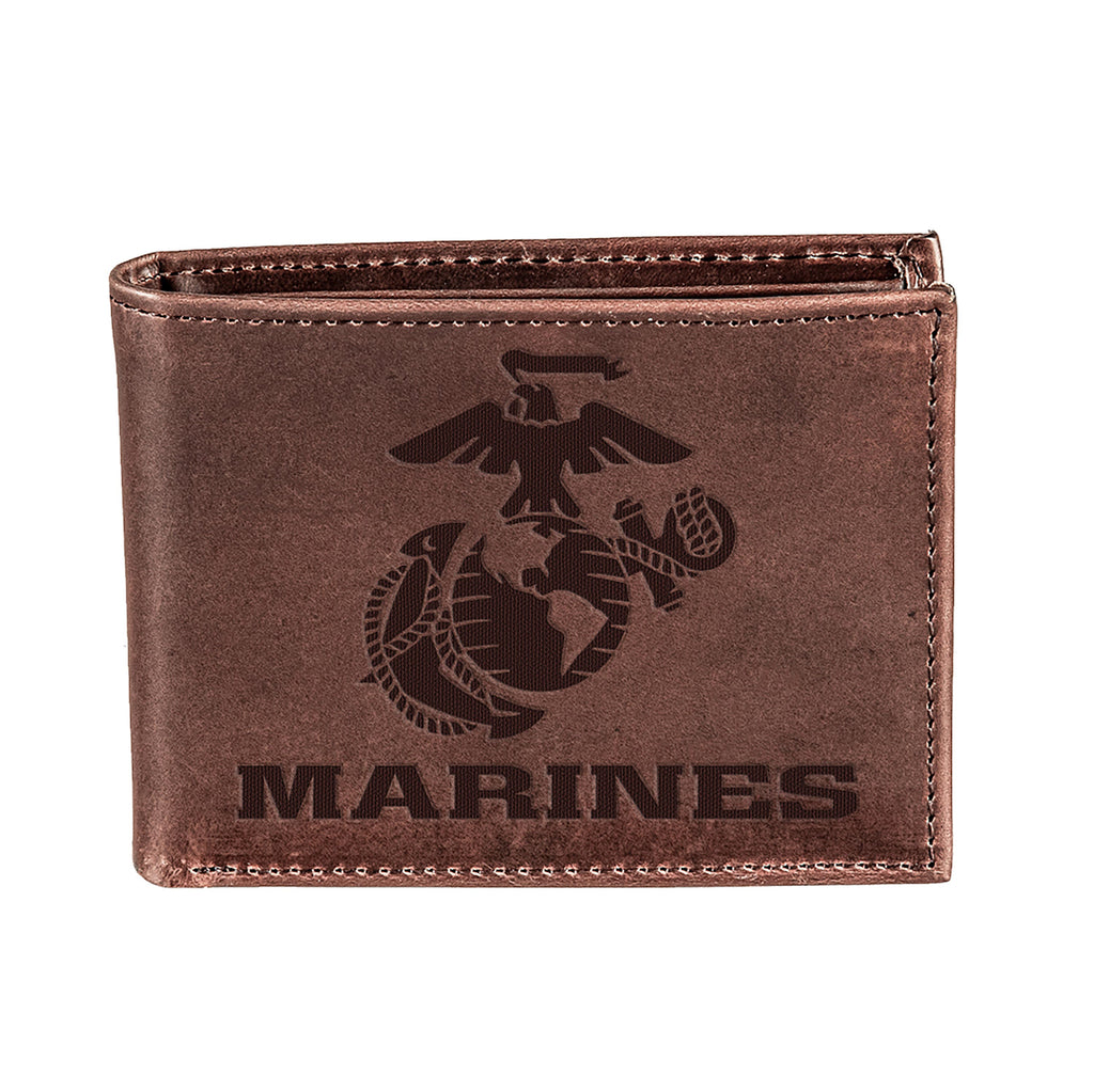 Show your pride for the US Marine Corps with this brown bi-fold wallet made from 100% genuine leather, combining durability with a stylish design.