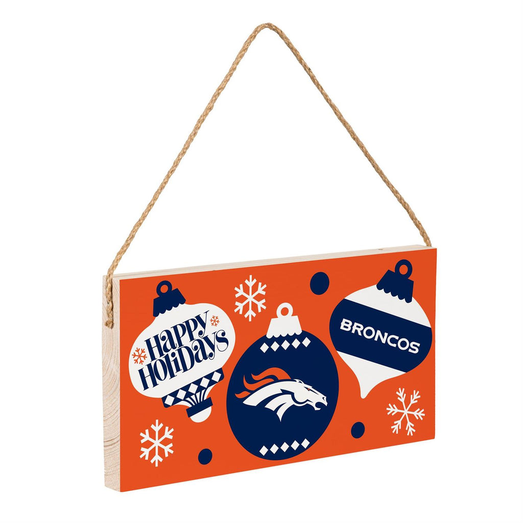 Celebrate the holiday season with the Denver Broncos Holiday Wood Wall Sign. Measuring 6x11 inches, this sign showcases festive ornament graphics and team branding, making it a perfect addition to any Broncos fan's holiday décor. Crafted from durable wood, it features a rustic rope for easy hanging, adding a charming touch to any space. Whether displayed on your wall or door, this sign is sure to spread holiday cheer and team spirit. Ideal for gifting or personal use, it's a must-have for loyal Broncos enthusiasts.
