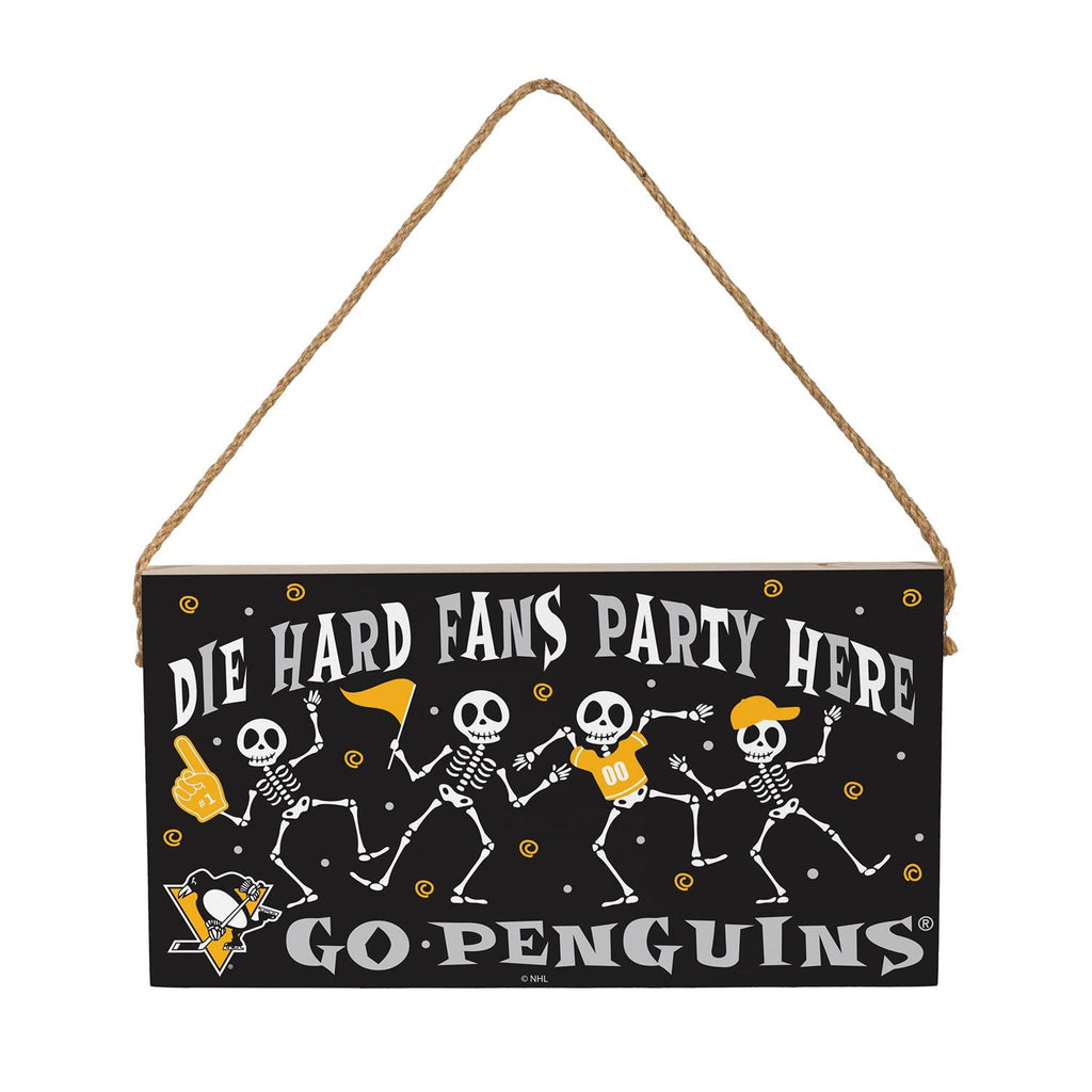 Get into the spooky spirit of the season with the Pittsburgh Penguins Halloween Wood Wall Sign. Perfect for die-hard fans, this 6x11 inch sign features a playful skeleton design cheering for the Penguins. Crafted from durable wood, it adds a festive touch to any room. The sign includes a convenient twine for easy hanging, making it an ideal decoration for your home or office. Celebrate Halloween with a nod to your favorite team and show your Penguins pride in style.