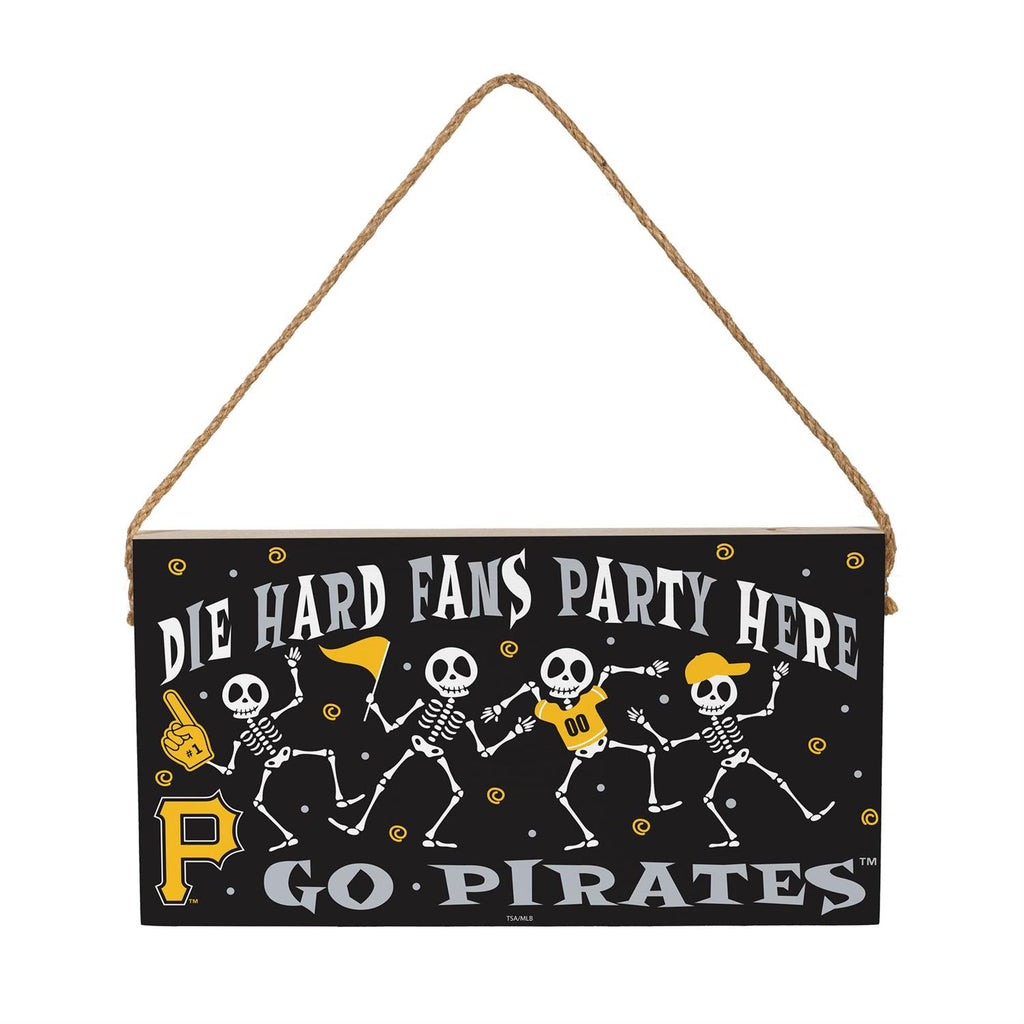 Celebrate your love for the Pittsburgh Pirates with this festive Halloween wood wall sign. Perfect for adding a spooky, team-spirited touch to your home, this 6x11 sign features playful skeletons and bold lettering that reads "Die Hard Fans Party Here." Made from durable wood, it is designed to last through many seasons of Halloween parties and game day celebrations. The rustic rope hanger makes it easy to display on any wall or door, ensuring your Halloween décor is both stylish and team-focused. Show off your Pirates pride with this unique seasonal accent.