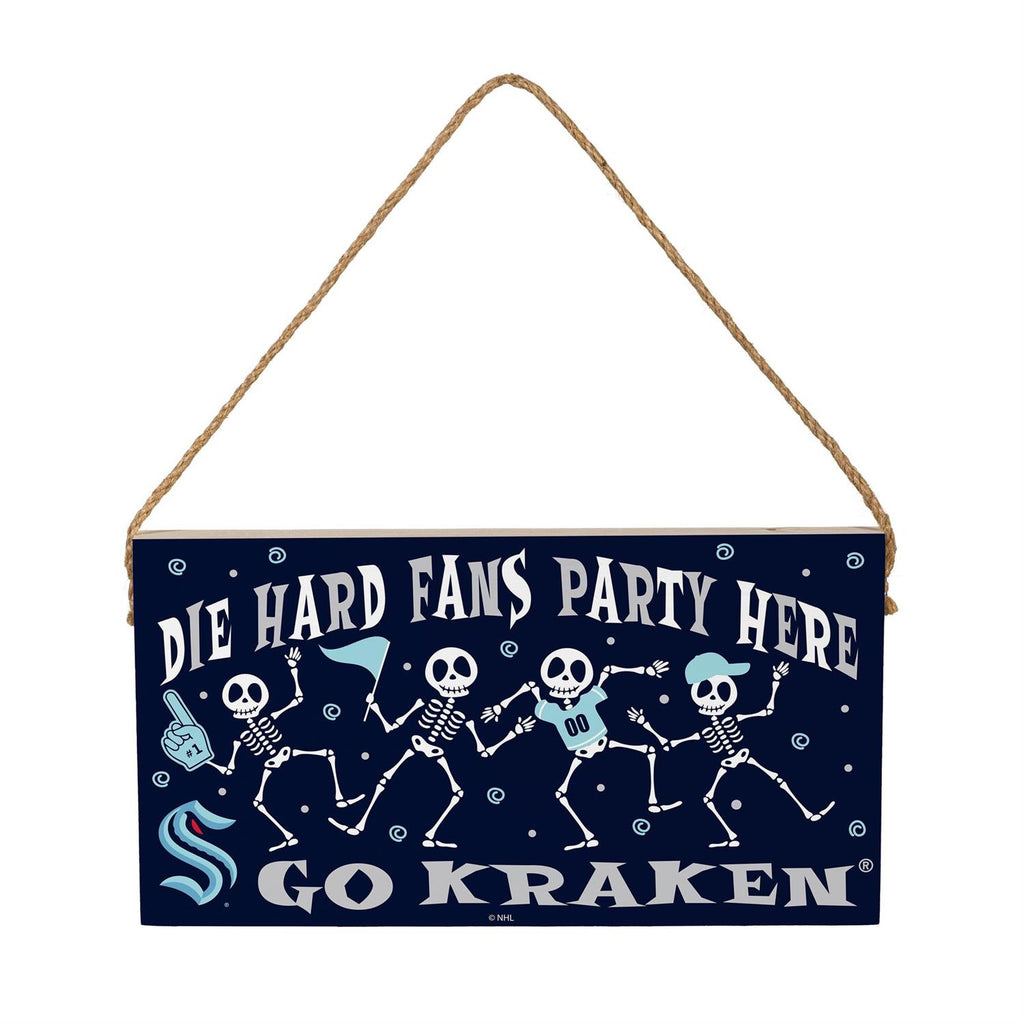 Celebrate your Halloween spirit and team pride with the Seattle Kraken Halloween Wood Wall Sign. Measuring 6x11 inches, this sign is perfect for adding a spooky touch to your home or party décor. Crafted from durable wood, it features playful skeleton graphics and bold lettering, making it an eye-catching addition to any space. The attached rope hanger allows for easy display, whether indoors or on a covered porch. Show your support for the Kraken while embracing the festive Halloween season.