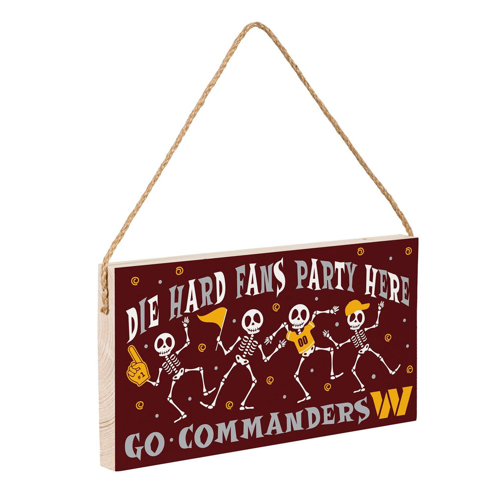 Celebrate the spooky season while supporting your favorite team with the Washington Commanders Halloween Wood Wall Sign. Measuring 6x11 inches, this sign is perfect for adding a festive touch to your home or party space. Made from durable wood, it features playful skeletons and team motifs in classic team colors, creating a fun and spirited atmosphere. Easily hang it on any wall with the included rope hanger to welcome fellow fans and Halloween enthusiasts alike. Ideal for both indoor and outdoor use, this sign is a must-have for any die-hard Commanders fan.