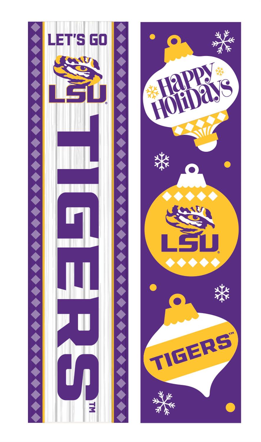 Showcase your LSU pride this holiday season with this 46-inch double-sided porch leaner. Perfect for any Tigers fan, this sign features vibrant school colors and festive Christmas designs, adding a spirited touch to your home exterior. Crafted for durability, it's ideal for both indoor and outdoor use, enhancing your porch, entryway, or garden. Its slim dimensions allow for easy placement while making a bold statement. Celebrate your team and the season in style with this versatile décor piece.