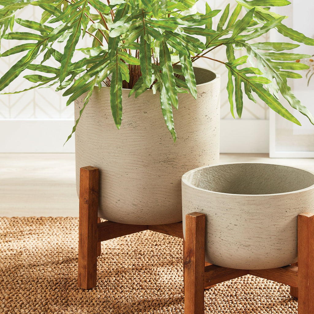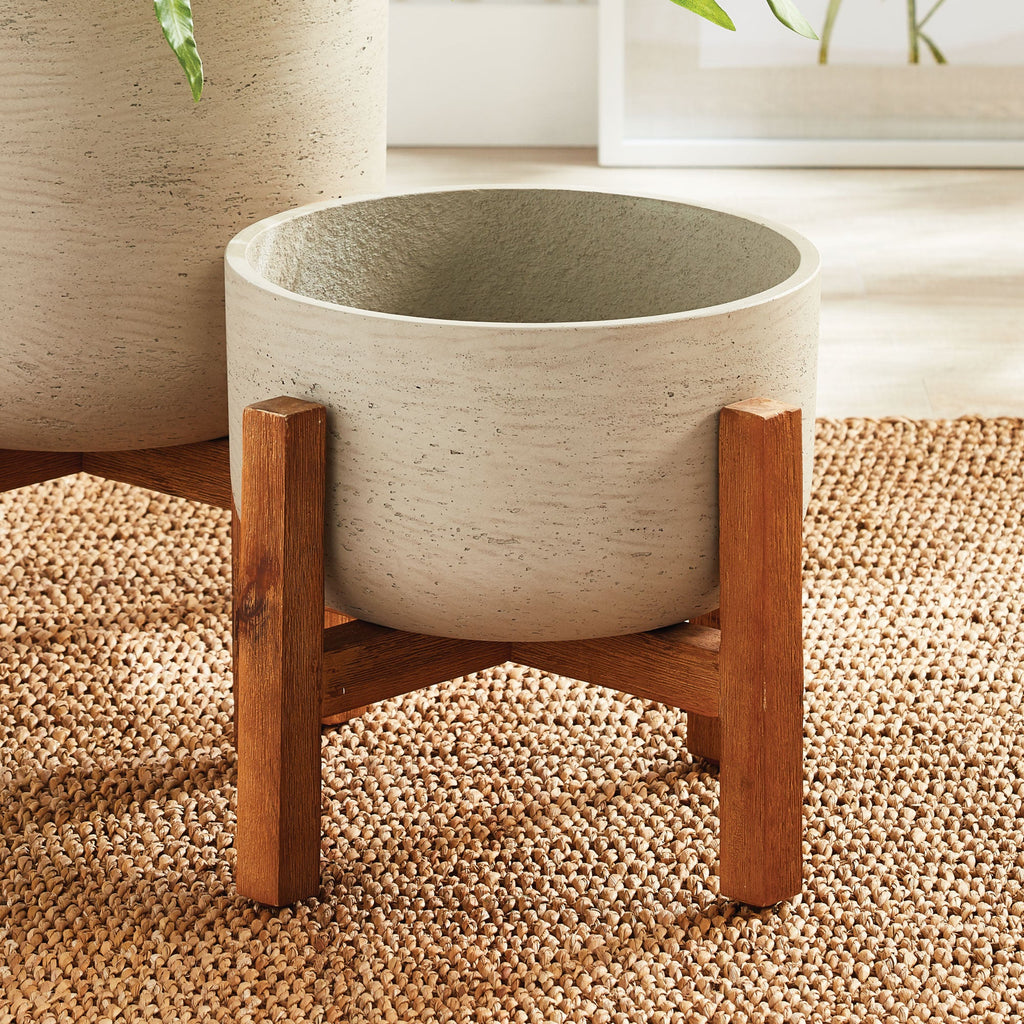 The modern industrial pots are expertly crafted with a blend of cement, fiberglass, sand, and acacia wood. Each pot is designed with a lightweight concrete structure supported by simple acacia wood stands, making them ideal for contemporary spaces.