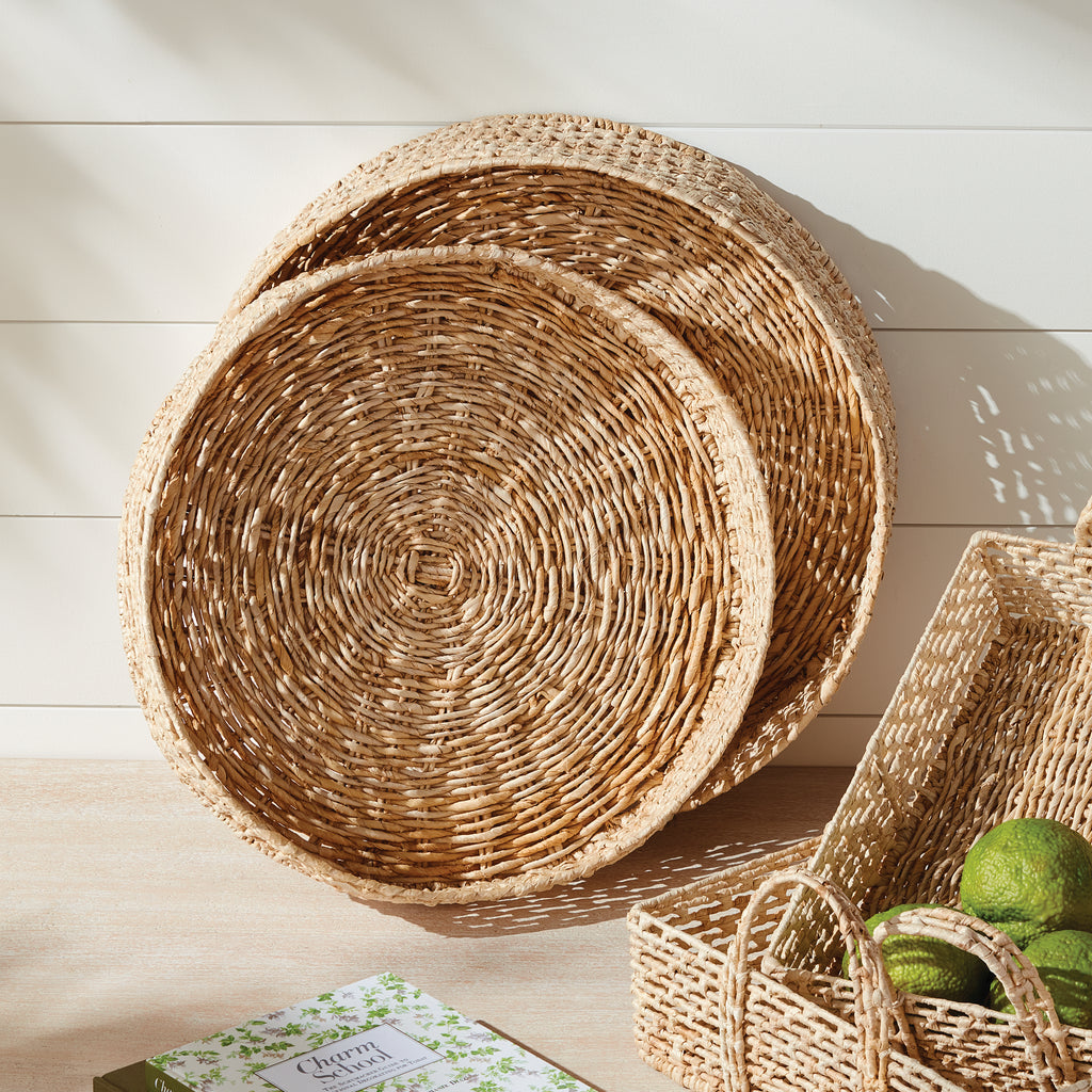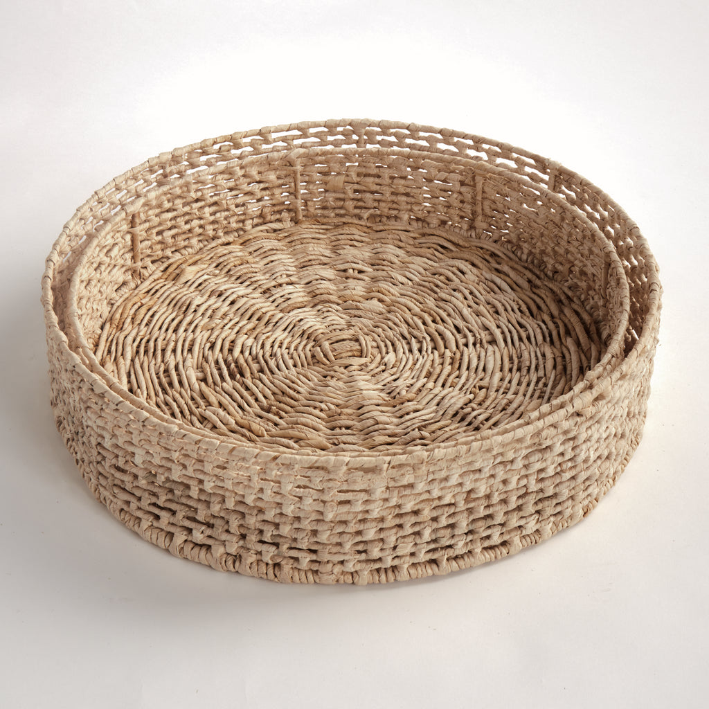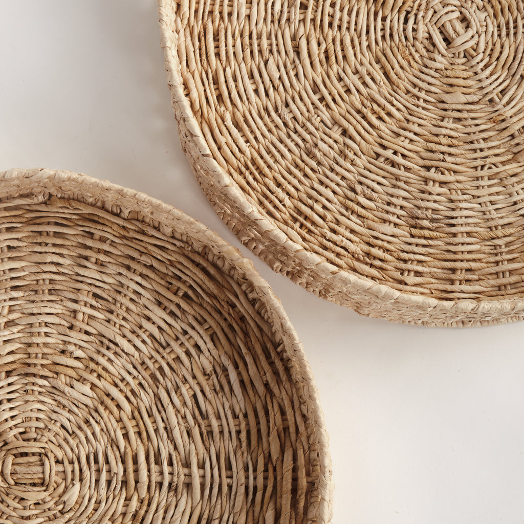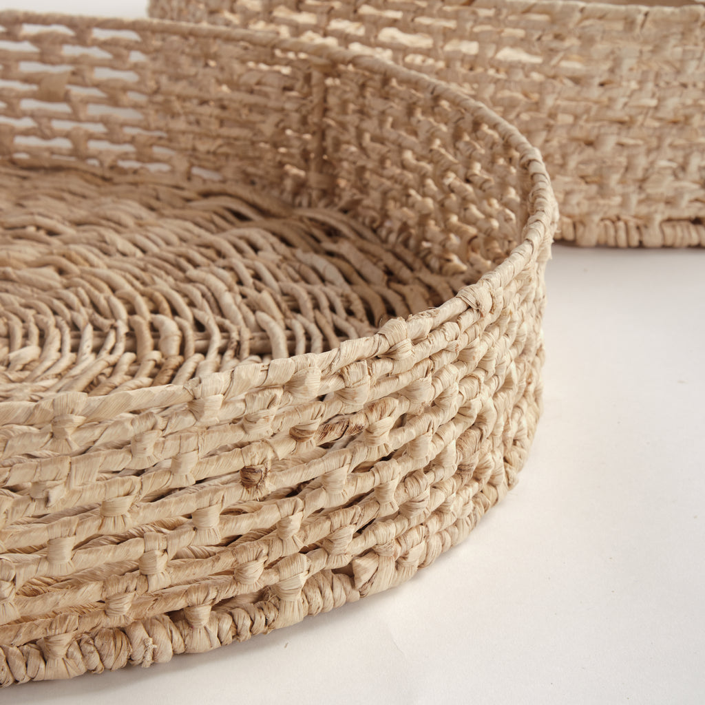 A species of banana, abaca is an upcycled, sustainable material. A very durable fiber, semi-bleached and varying in color, these baskets feature an open, criss cross weave, done by skilled artisans. Created to be overscale for wide open spaces, this set is perfect for ottoman, console or side table.