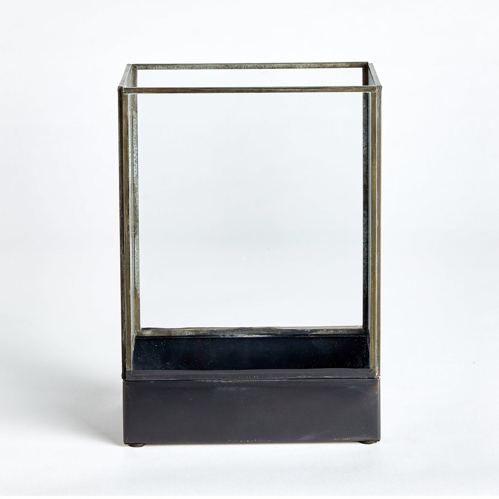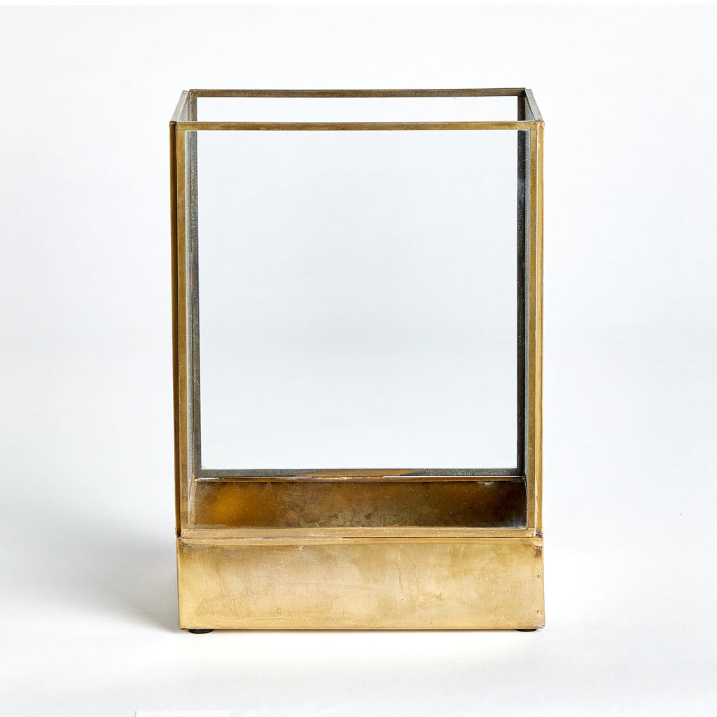 In a classic mix of glass and brass, this wide open design features your favorite candle display in a simple and clean way. Great along a hearth, or on a covered front porch for extra charm.