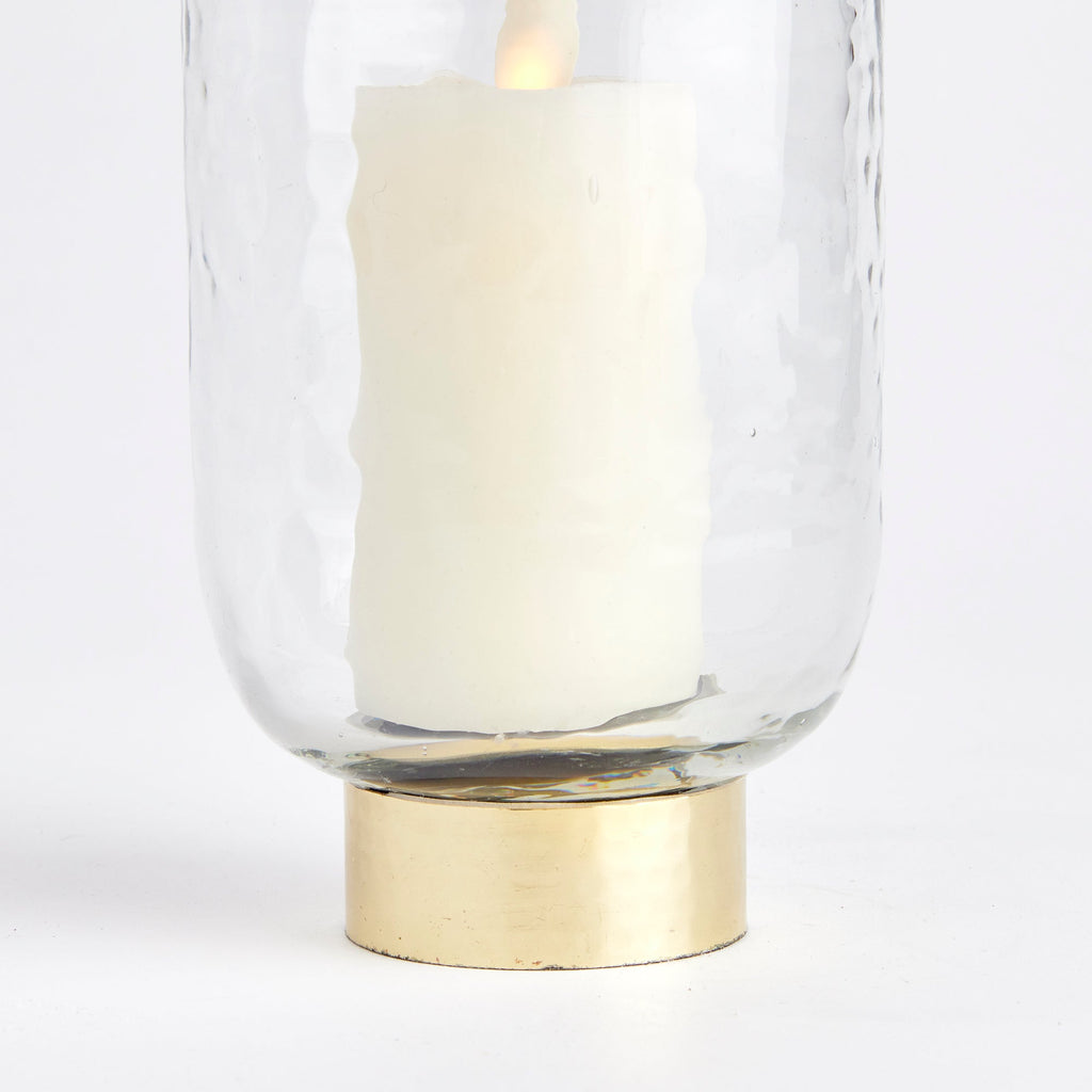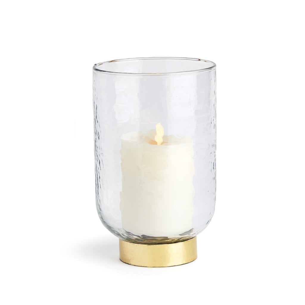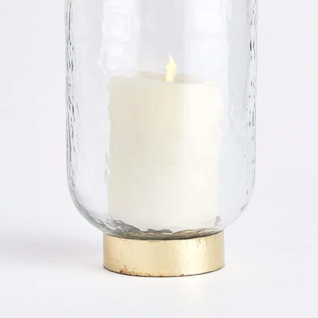 The stunning hurricane candle holders are available in a variety of sizes and finishes, each designed to enhance the ambiance of any interior space. Crafted with attention to detail, these hurricanes are made of high-quality glass, featuring a naturally uneven melted edge that adds an artisan's touch. Some variants are complemented by a hammered gold rim or a sleek silver or champagne aluminum base, offering a refined and elegant accent for any console, bookshelf, or mantel.