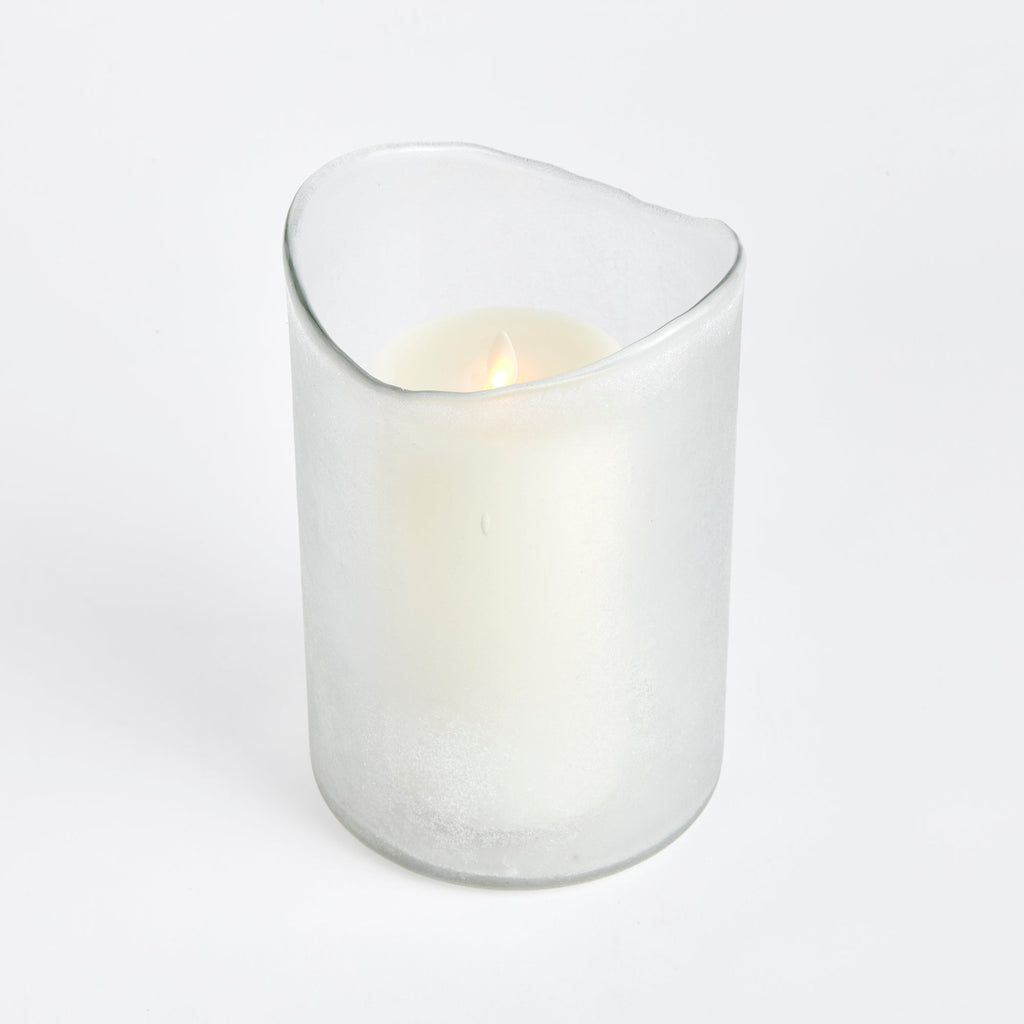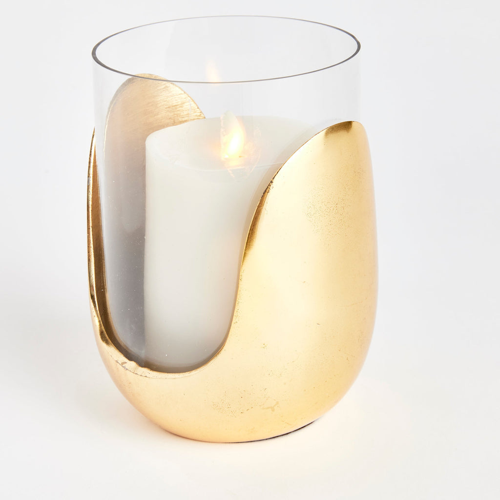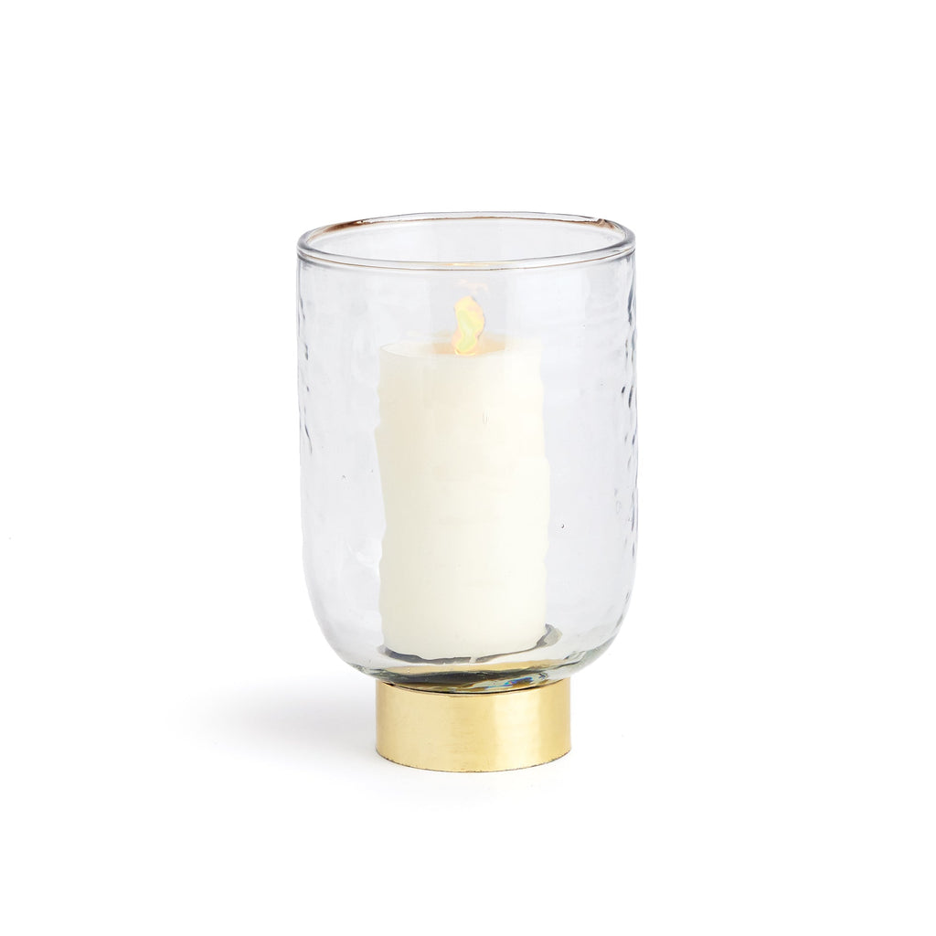 The stunning hurricane candle holders are available in a variety of sizes and finishes, each designed to enhance the ambiance of any interior space. Crafted with attention to detail, these hurricanes are made of high-quality glass, featuring a naturally uneven melted edge that adds an artisan's touch. Some variants are complemented by a hammered gold rim or a sleek silver or champagne aluminum base, offering a refined and elegant accent for any console, bookshelf, or mantel.