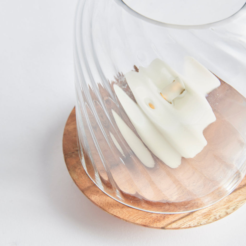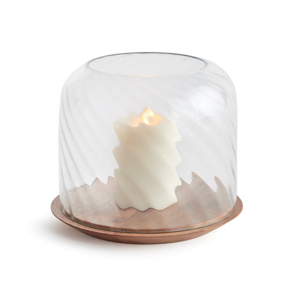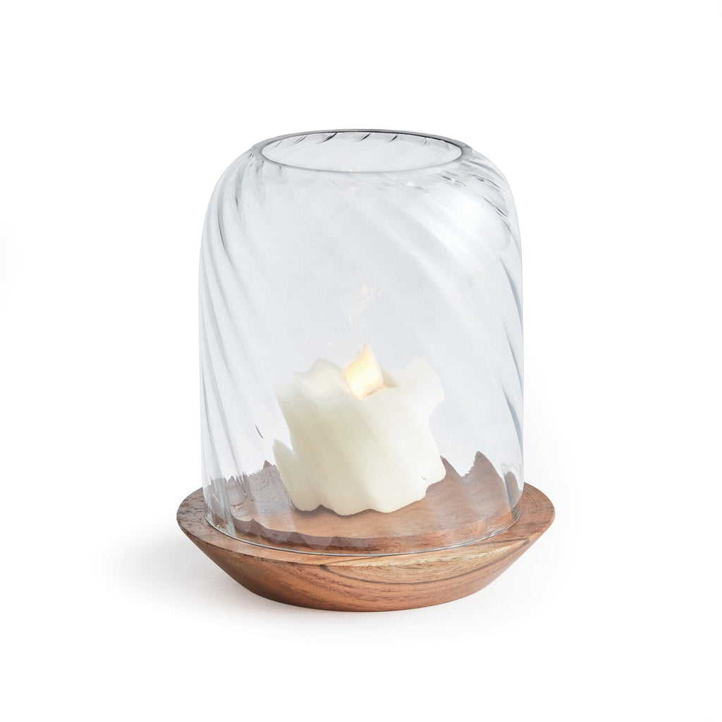 - Material: Glass with options for either real flower petals encased within or an optic swirl blown glass vessel paired with a turned acacia wood base.