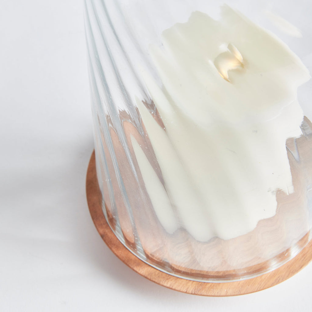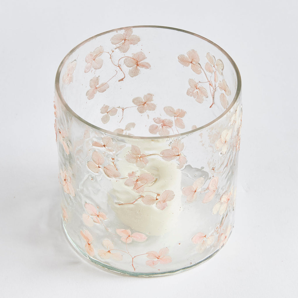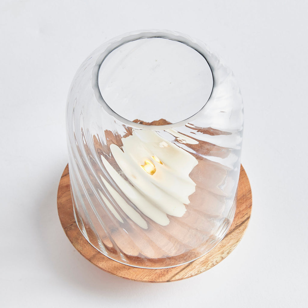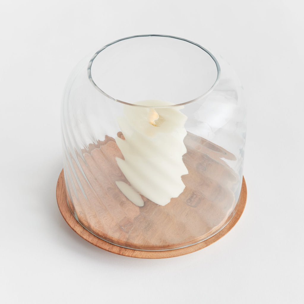 - Material: Glass with options for either real flower petals encased within or an optic swirl blown glass vessel paired with a turned acacia wood base.