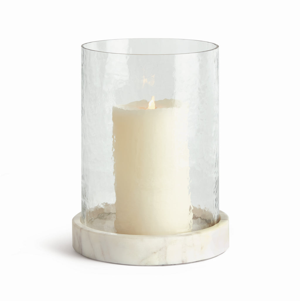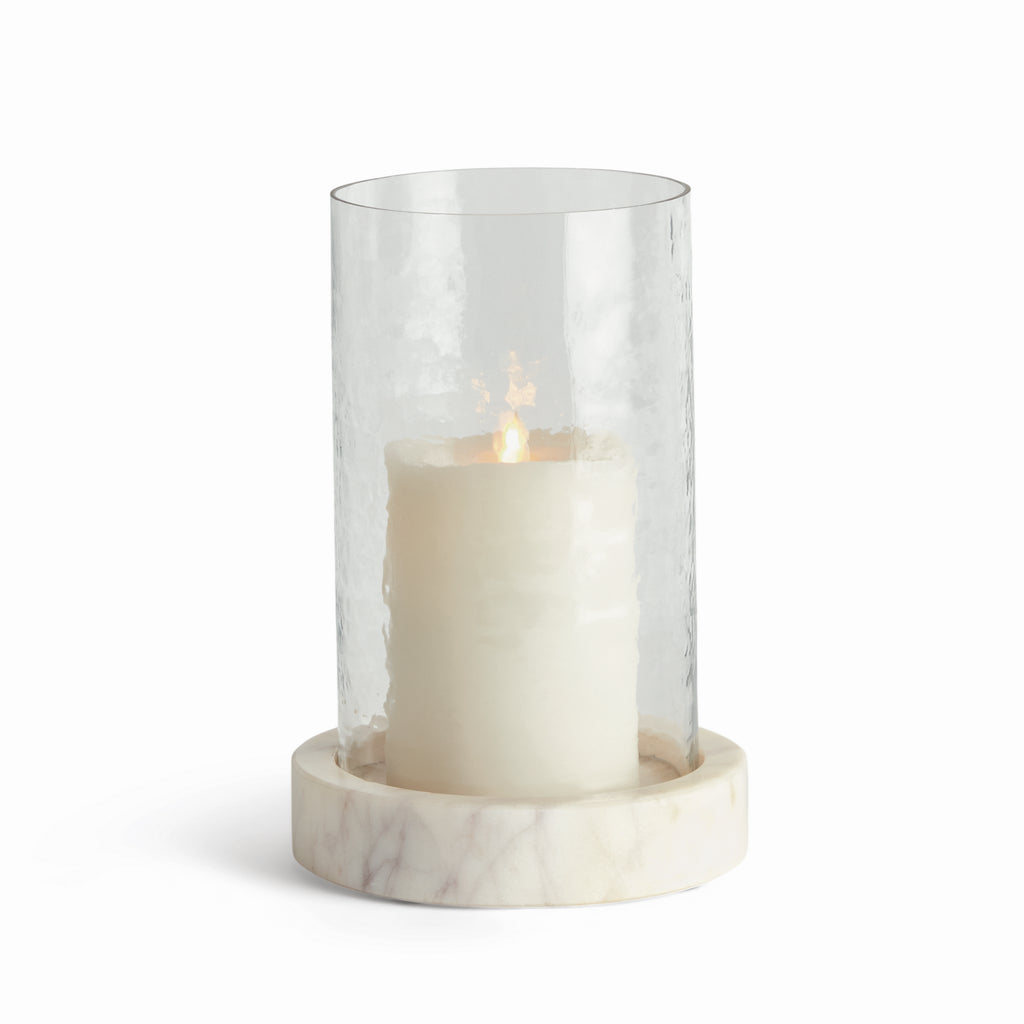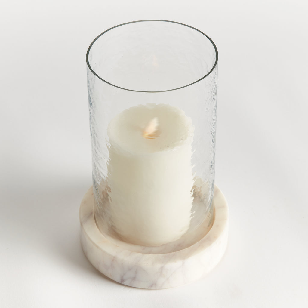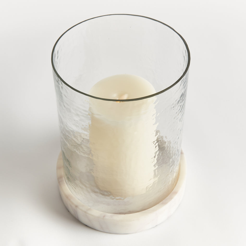 With a hammered glass vessel that sits inside a simple marble tray, this hurricane is decidedly modern. The hammered glass adds a bit of texture to the otherwise understated design. A beautiful addition to a kitchen island, coffee table, or ottoman.