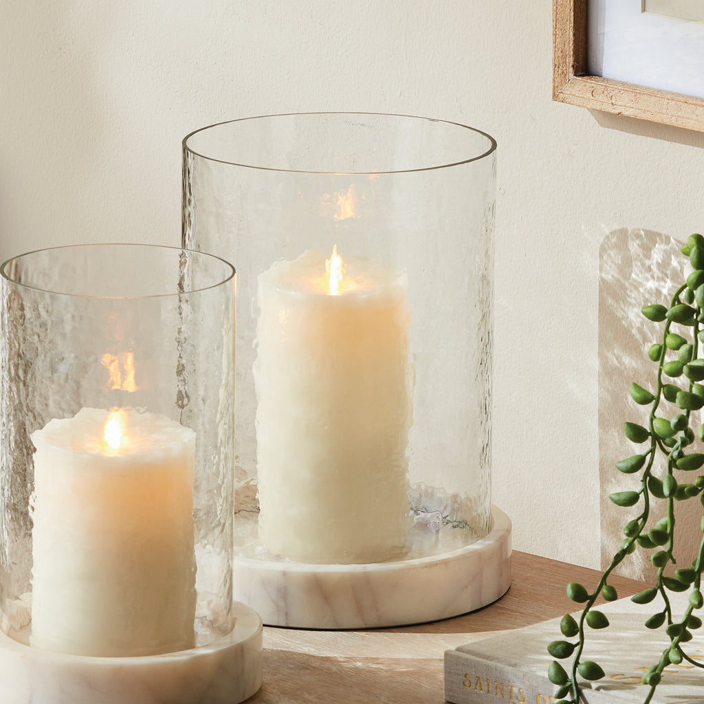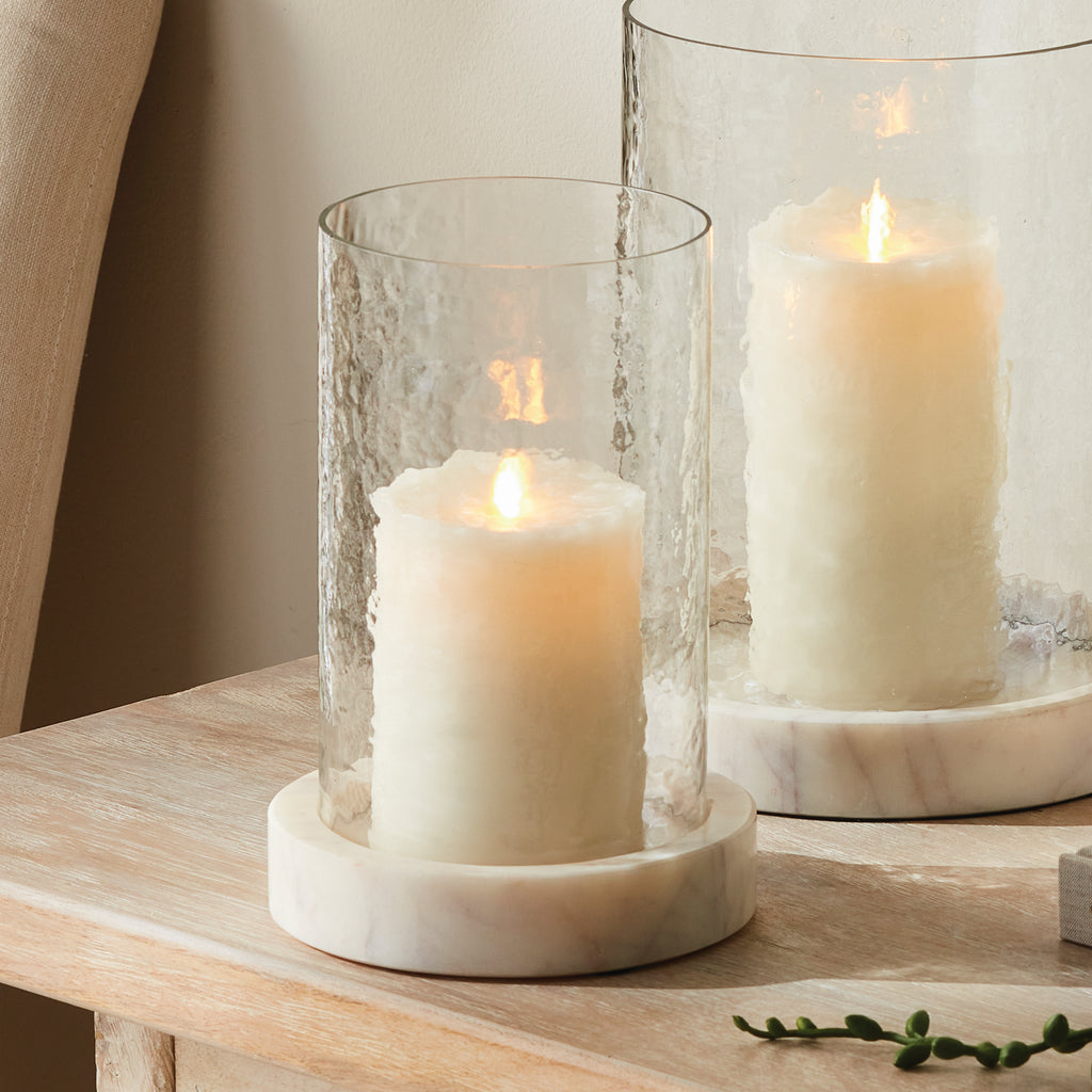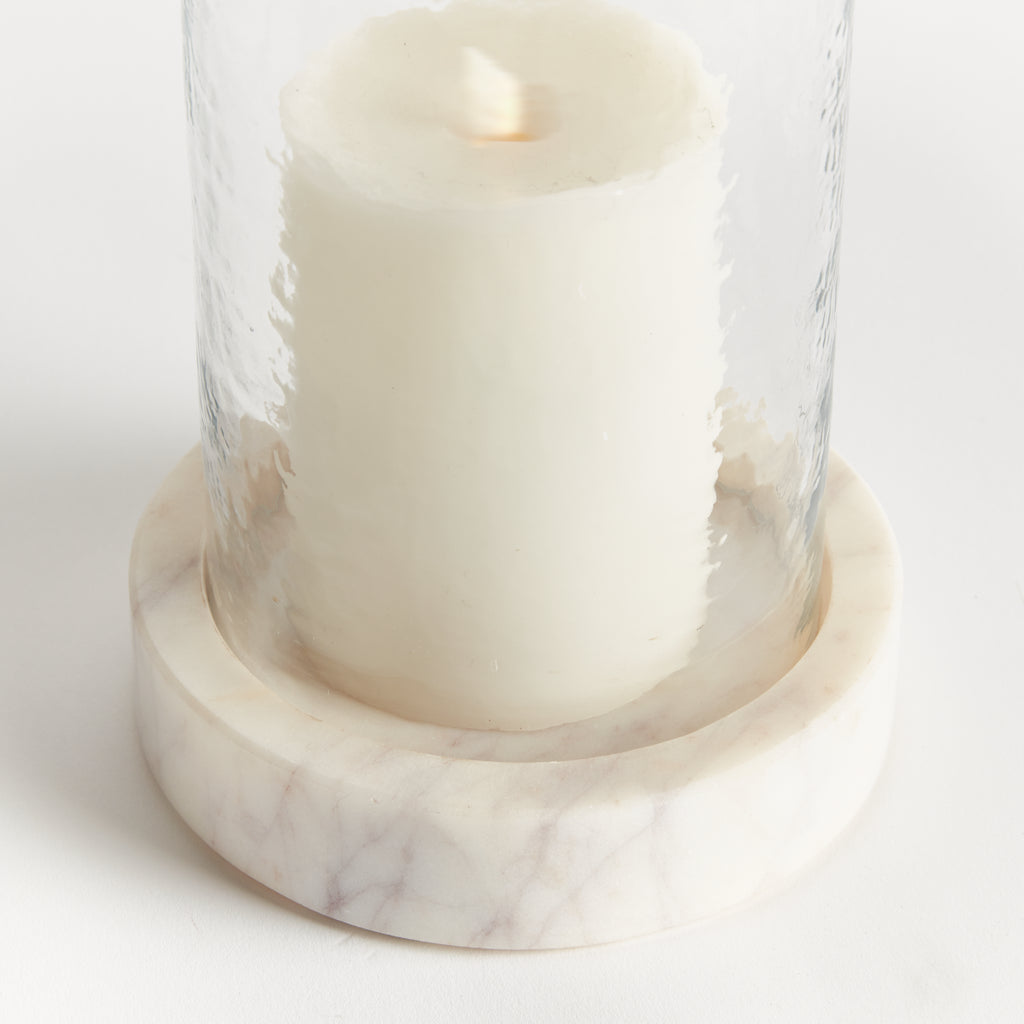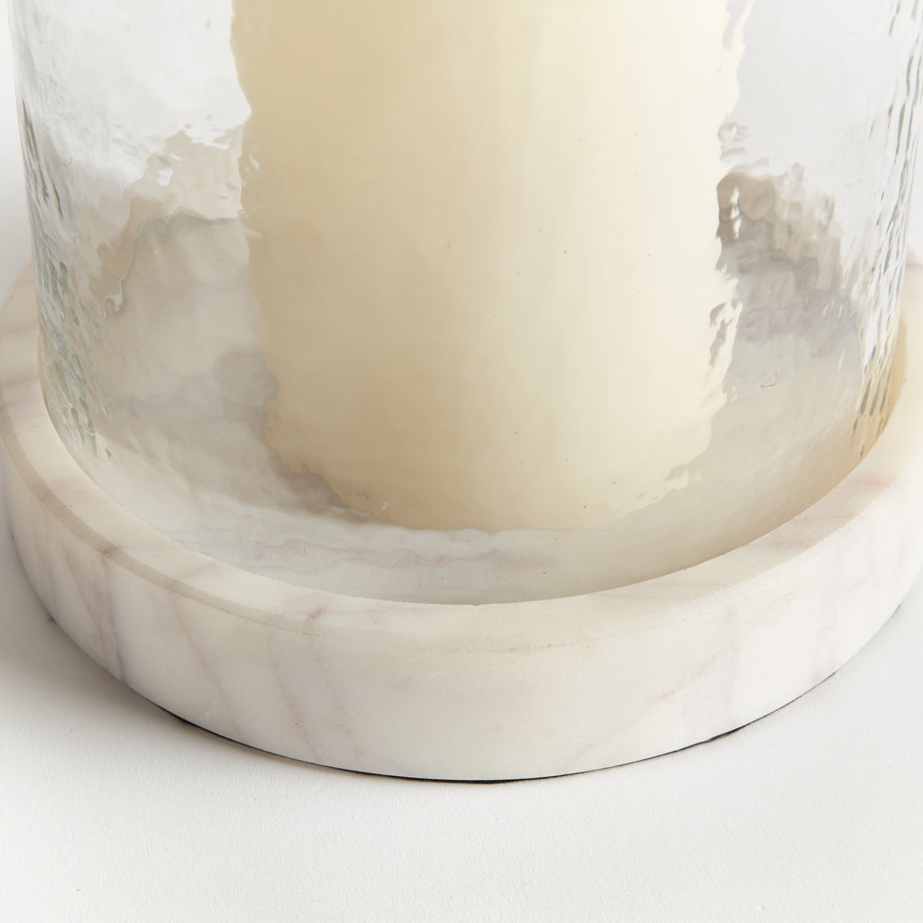 With a hammered glass vessel that sits inside a simple marble tray, this hurricane is decidedly modern. The hammered glass adds a bit of texture to the otherwise understated design. A beautiful addition to a kitchen island, coffee table, or ottoman.