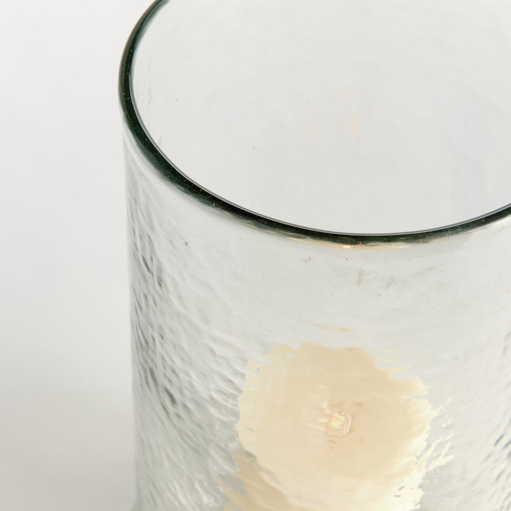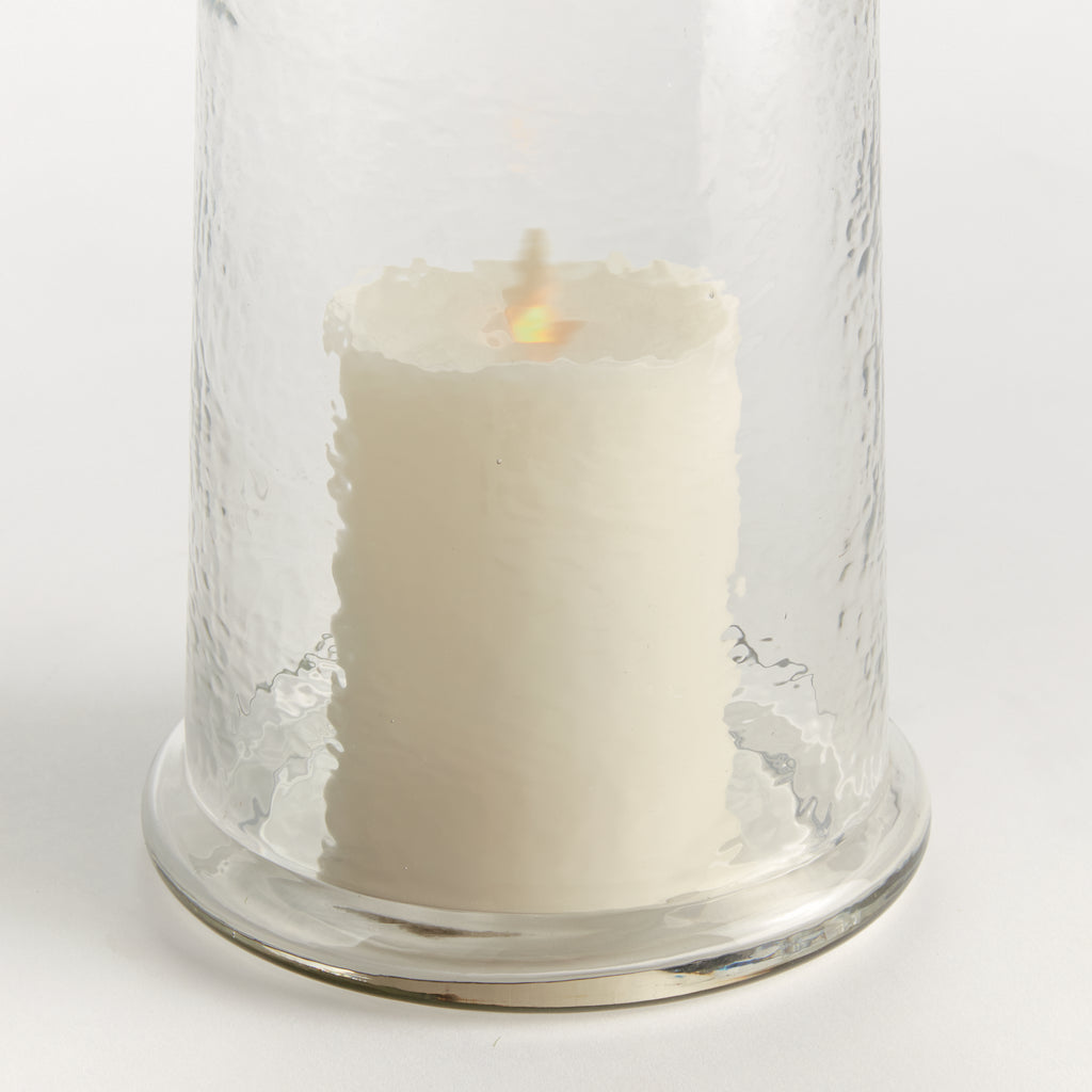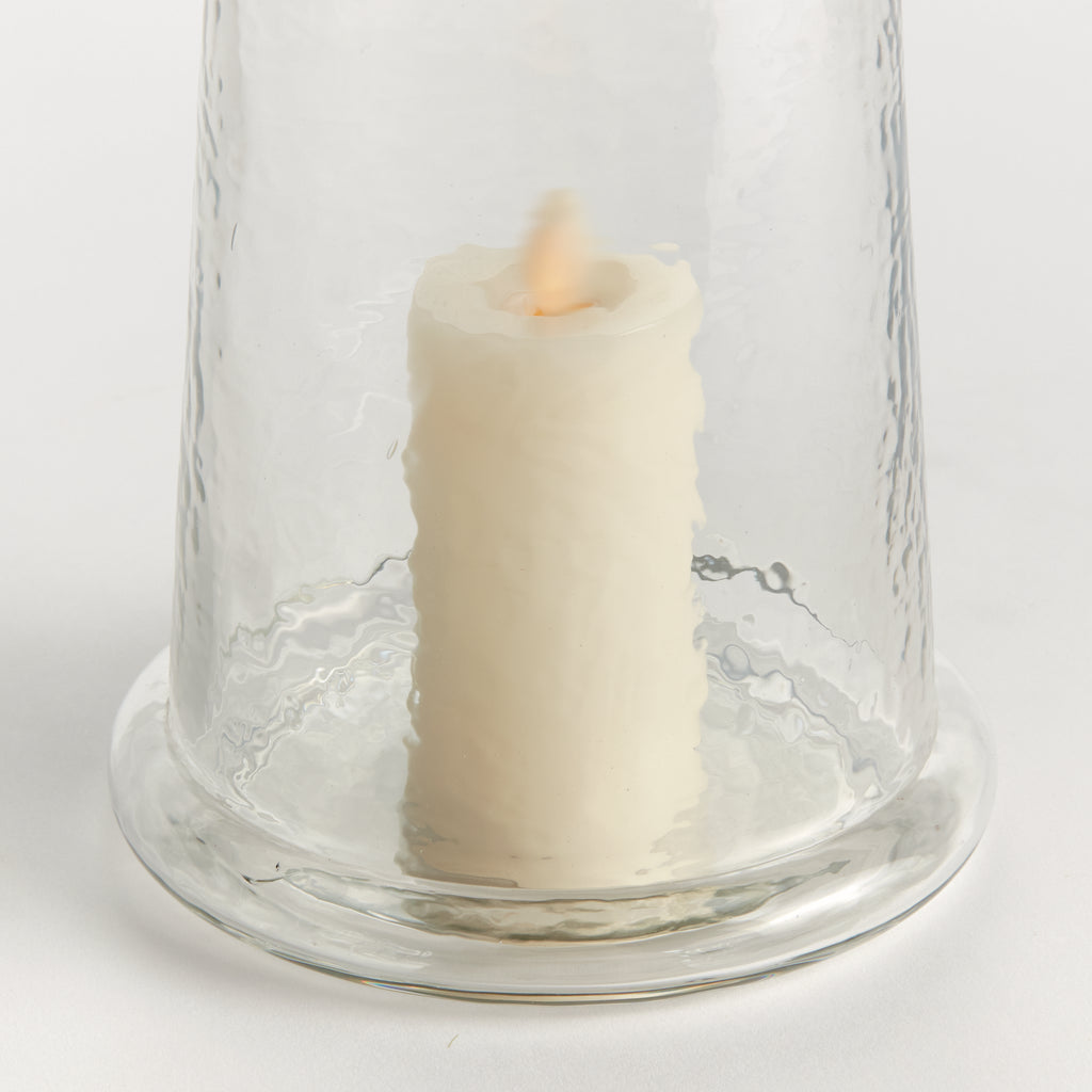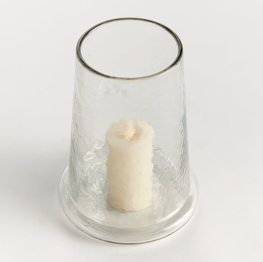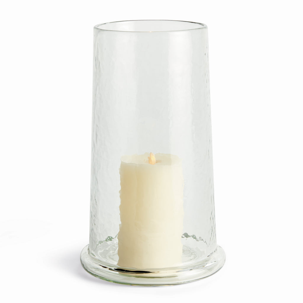 In a tapered silhouette, this mouth blown glass hurricane is a versatile accent piece. The hammered surface adds a touch of artistry, making it a perfect addition to any setting. Whether featuring a warm pillar candle or a fresh flower arrangement, it offers a pop of color and elegance.