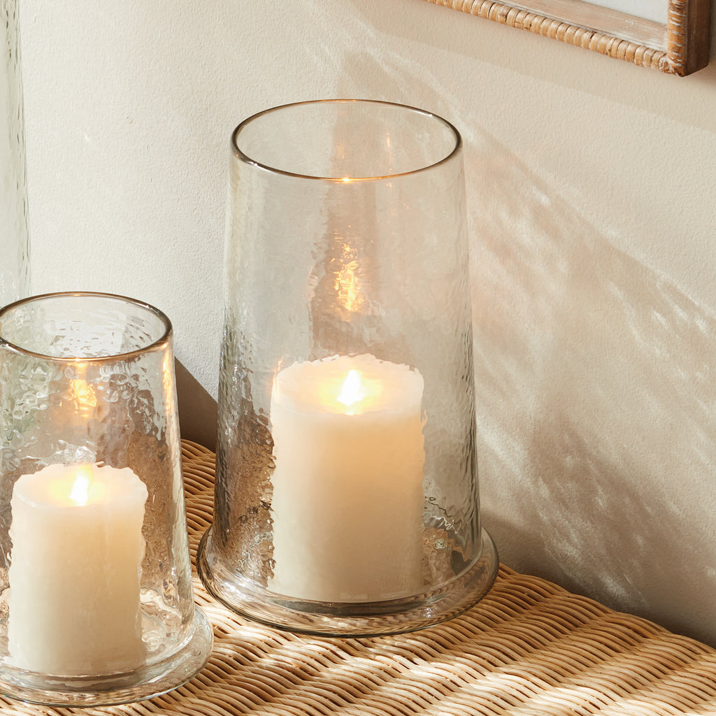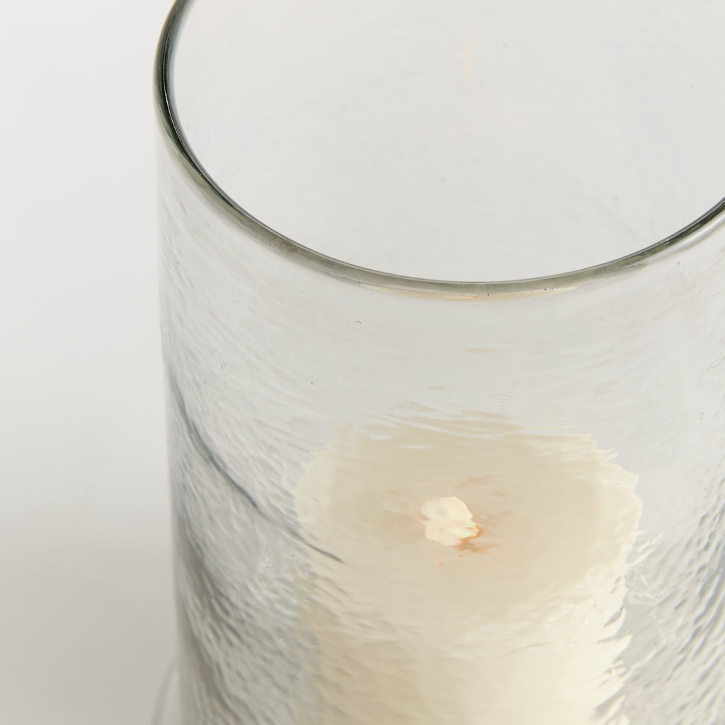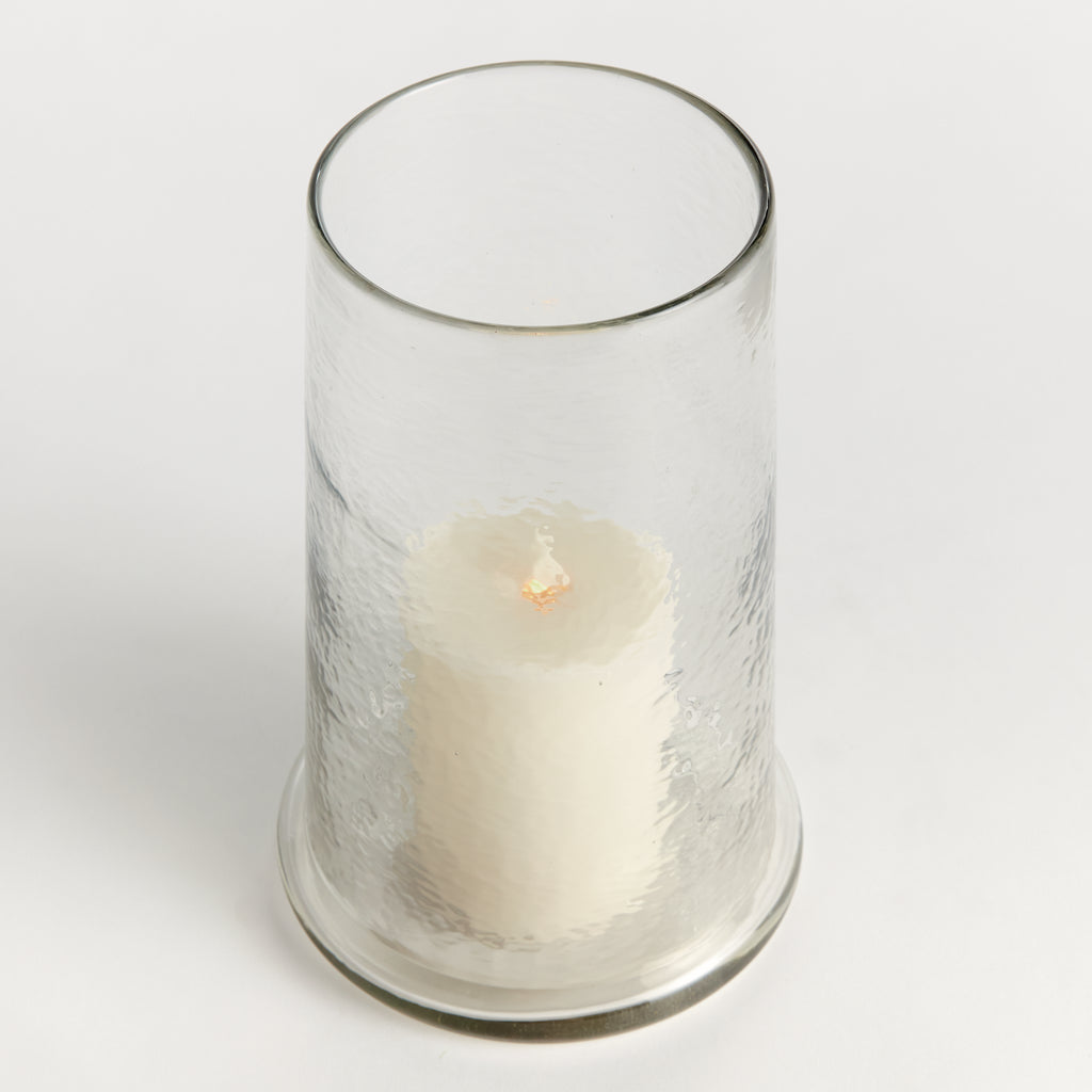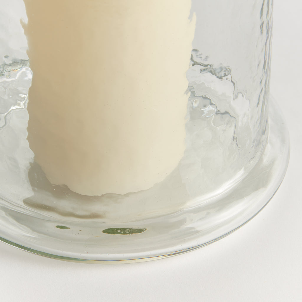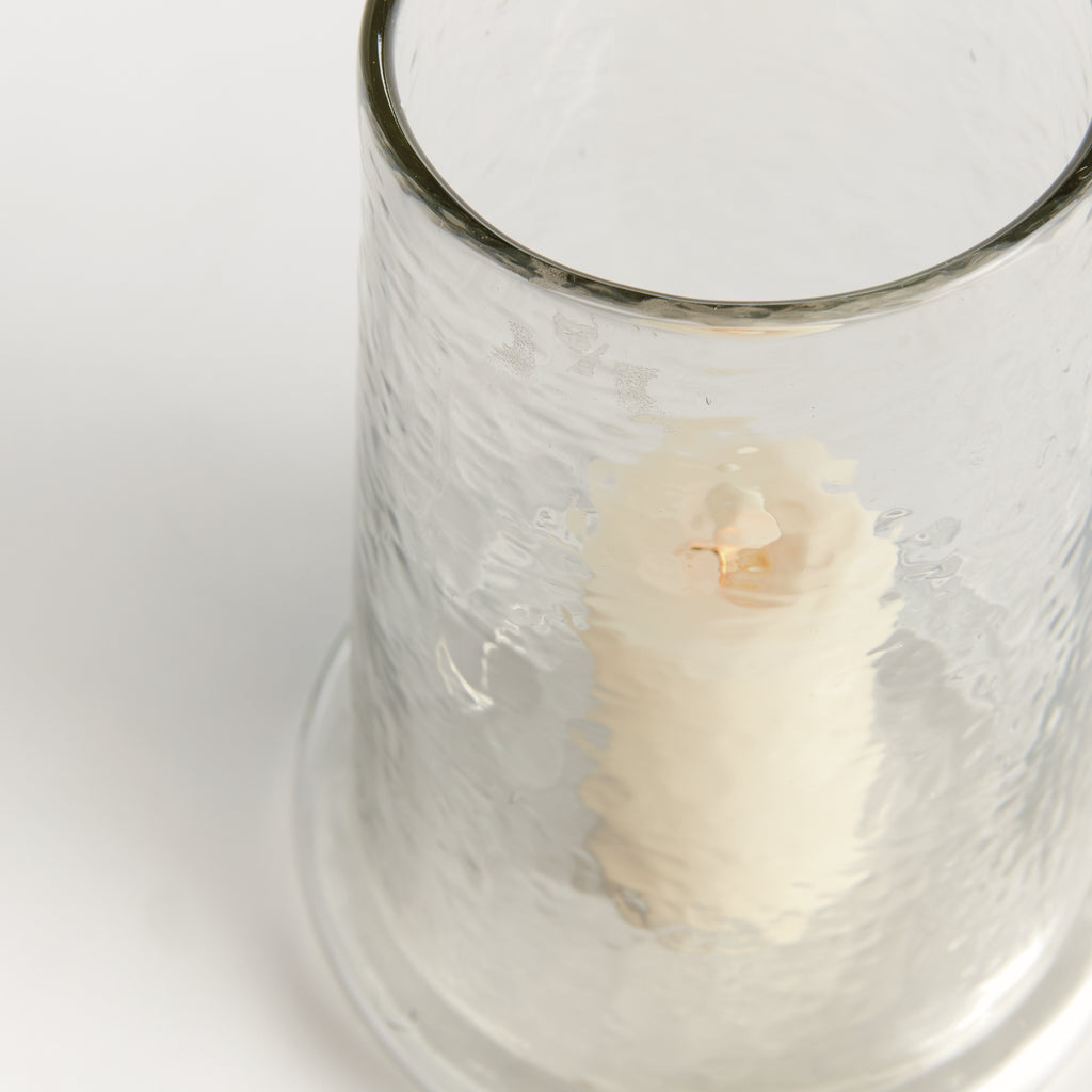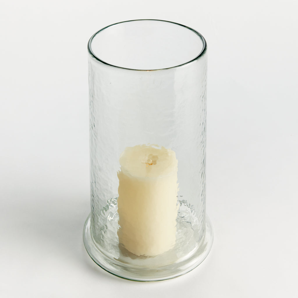 In a tapered silhouette, this mouth blown glass hurricane is a versatile accent piece. The hammered surface adds a touch of artistry, making it a perfect addition to any setting. Whether featuring a warm pillar candle or a fresh flower arrangement, it offers a pop of color and elegance.