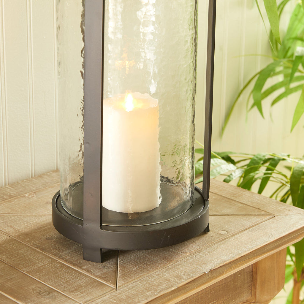 The perfect blend of industrial modern and traditional form, these hurricanes are designed to enhance any space with their versatile style. Each piece features Black Bronze and Hammered Glass, offering a warm weathered patina that fits beautifully into both modern and casual settings.