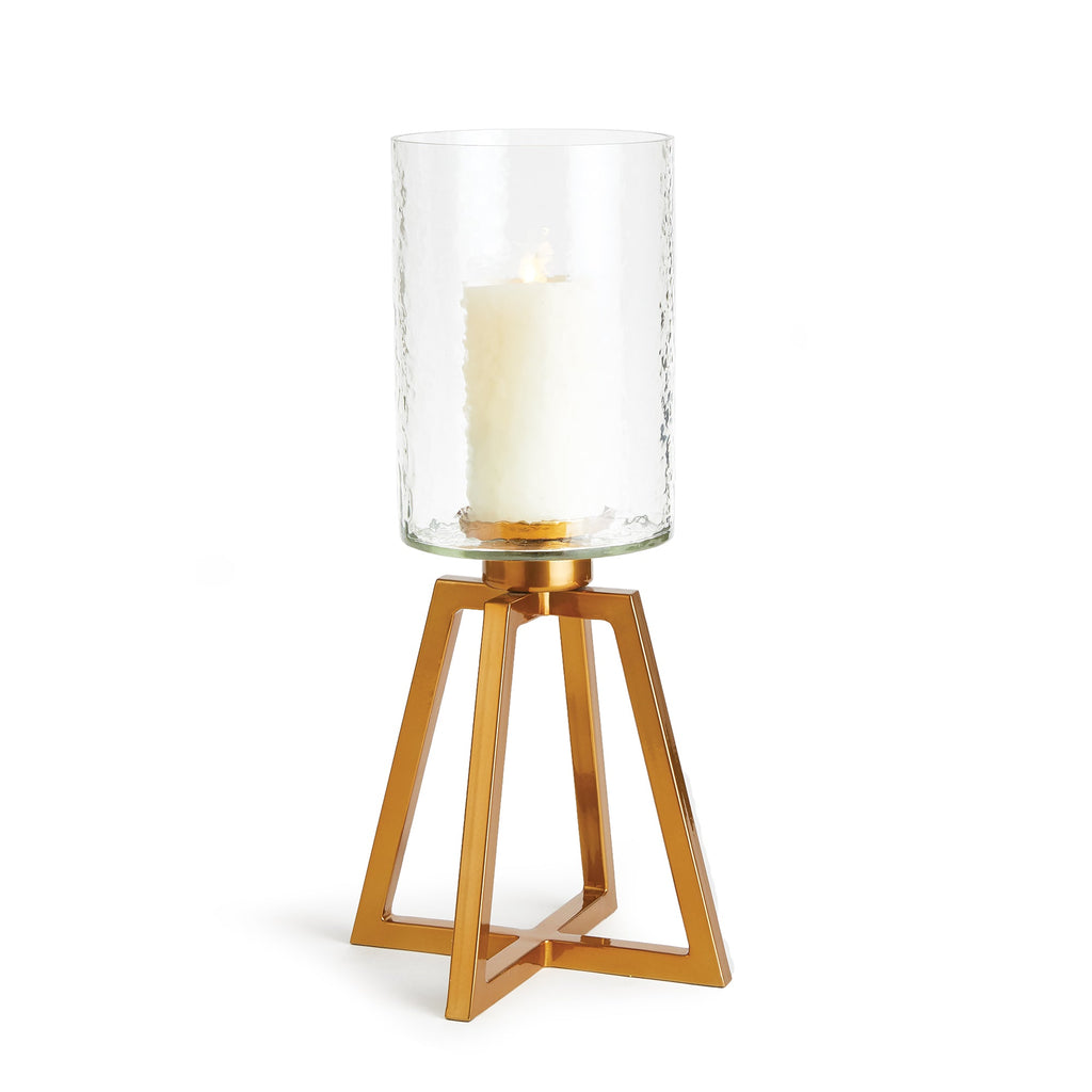 - Features a tall, tapered metal base and hammered glass hurricane for a minimalist design, perfect for industrial modern spaces.