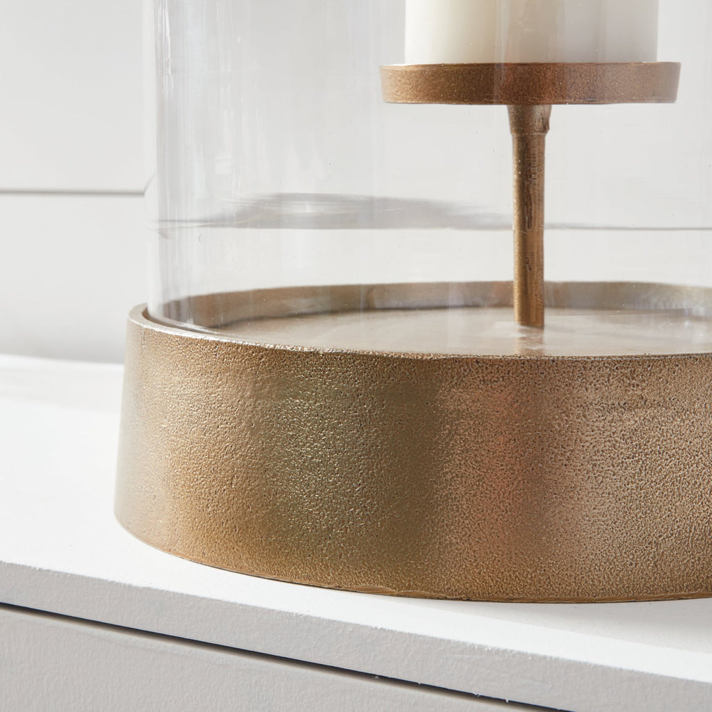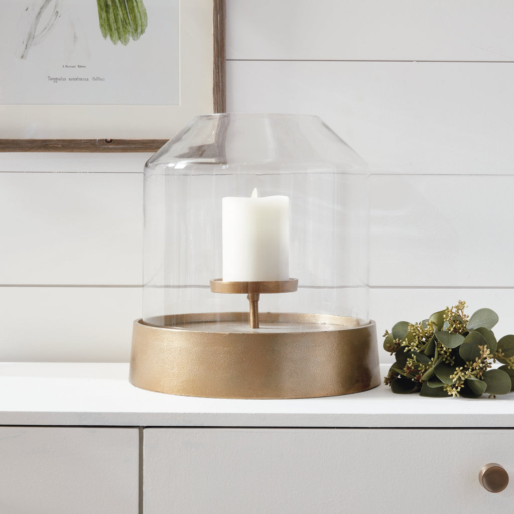 The Kenmare Hurricane is a substantial and elegant piece designed to add volume and height to your candle display. It features an antique brass finish and is crafted from aluminum and glass, ensuring both durability and style. The dimensions are approximately 13 x 13 x 17 inches, making it a perfect centerpiece for your interior decor. Please note that the candle is not included.
