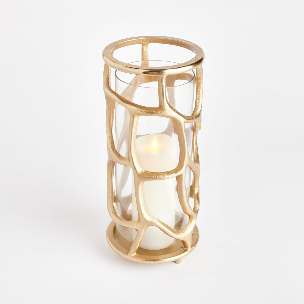 The artisan hurricane lantern is available in multiple sizes and finishes, including gold, black, and gray. It is crafted from sturdy materials such as aluminum and glass or glass and iron. The gold variants feature a hand-sculpted meandering design with a matte finish, perfect for dressing up any modern interior space. The black and gray variants are powder-coated for outdoor use, drawing inspiration from old European style lanterns, and are designed to evolve over time with exposure to the elements.