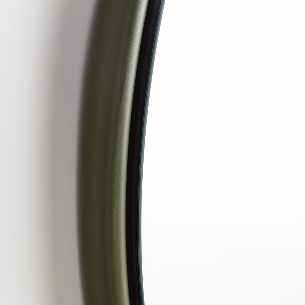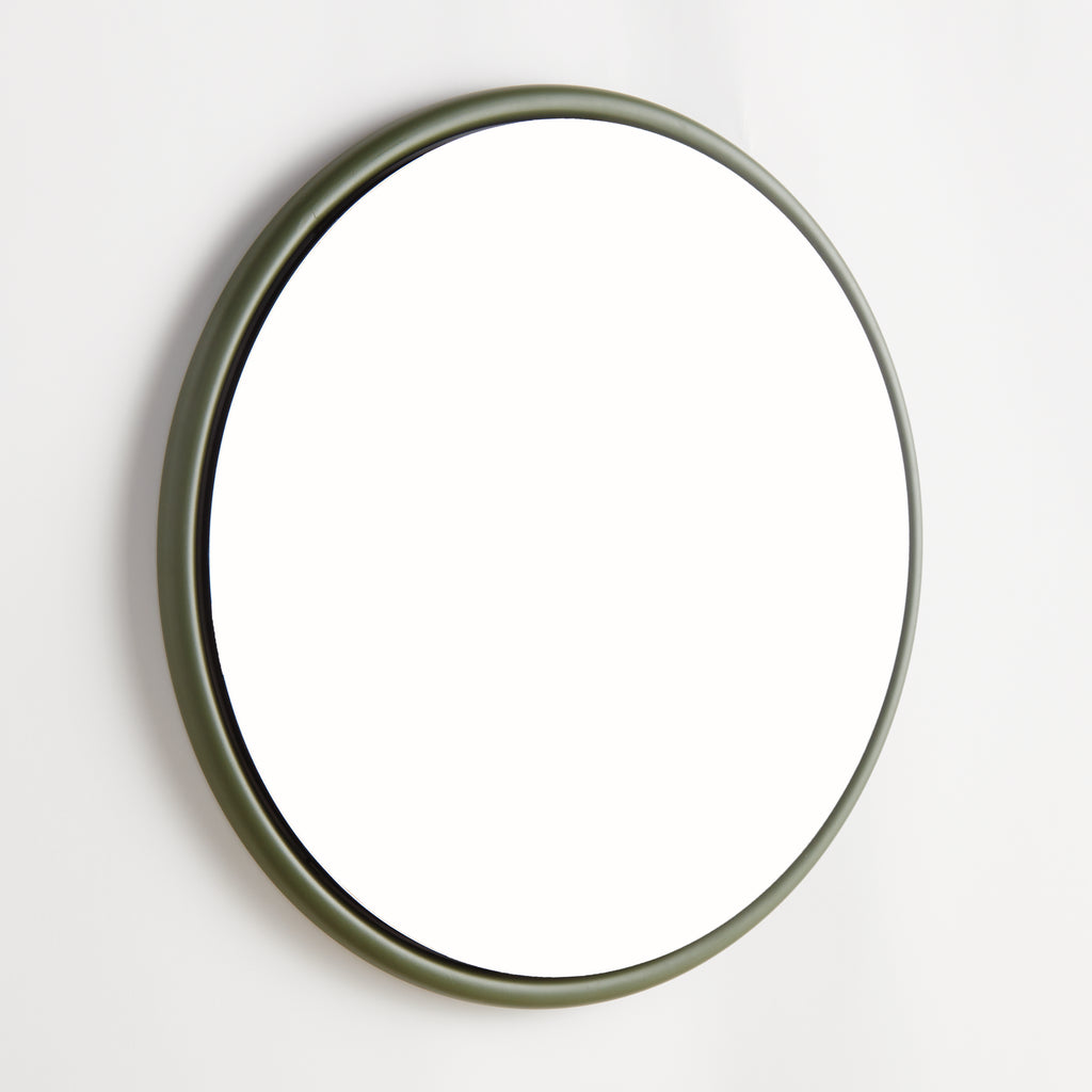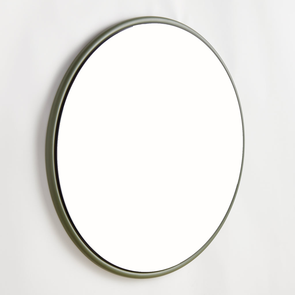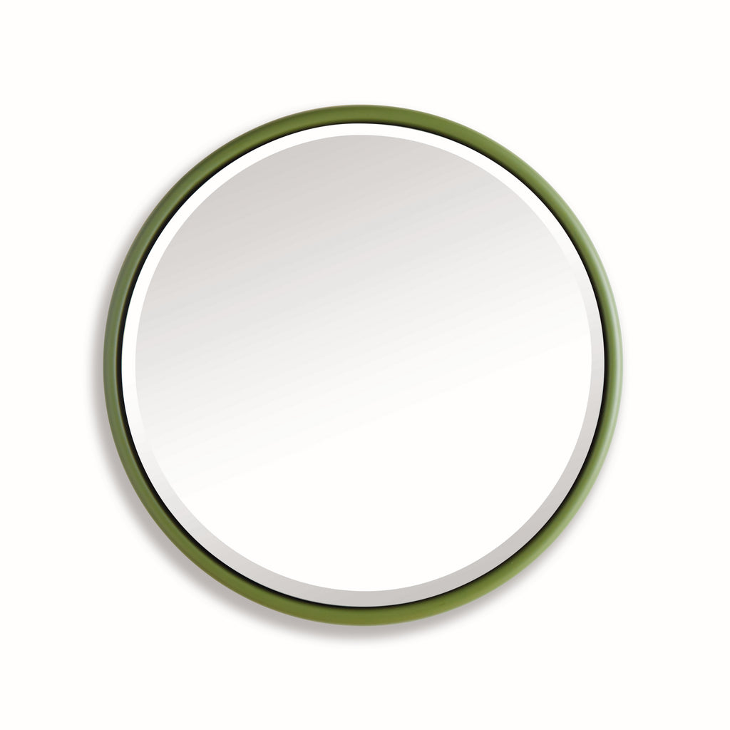 This sleek round iron stock frame in olive green is an inspired look. With a beveled edge, this stylish mirror creates a bold focal point. Perfect for powder room, bedroom, or study. Adding a mirror to any space in your home highlights your light sources while making the room feel more dimensional.