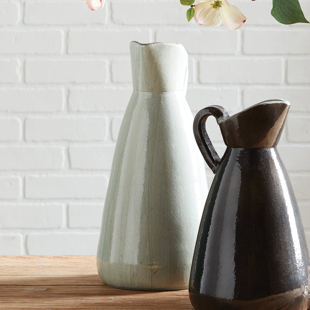 Handcrafted by skilled artisans, these vintage-inspired neutral milk jugs ooze character and charm. Each piece is an original and varies in size and color, making them unique additions to any space. From their unique shapes to the dripping, uneven glaze, they create a sophisticated vignette. Made from clay and paint, these jugs are available in Light Taupe, Light Gray, and Dark Gray.