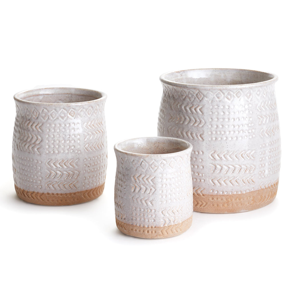 The Amory Pots are crafted with a mid-century style inspired by craft potters, featuring a unique teardrop pattern that adds an eclectic touch to any space. Available in three sizes: 6.75 x 6.75 x 6.75 inches, 5.25 x 5.25 x 5.25 inches, and 4 x 4 x 4 inches, these pots are made from high-quality ceramic.
