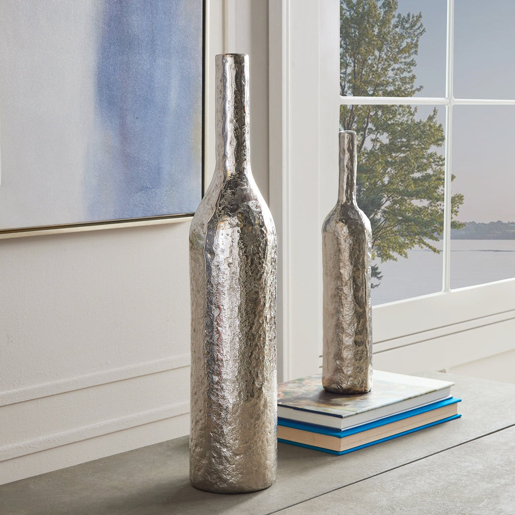 Vases: A tall and slender bottle form with a rich texture makes our aluminum vases a striking and unconventional accent. Perfect for adding a faux stem or displaying as is for a fresh, modern look. Ideal for bookshelf, console, or kitchen counter placement.