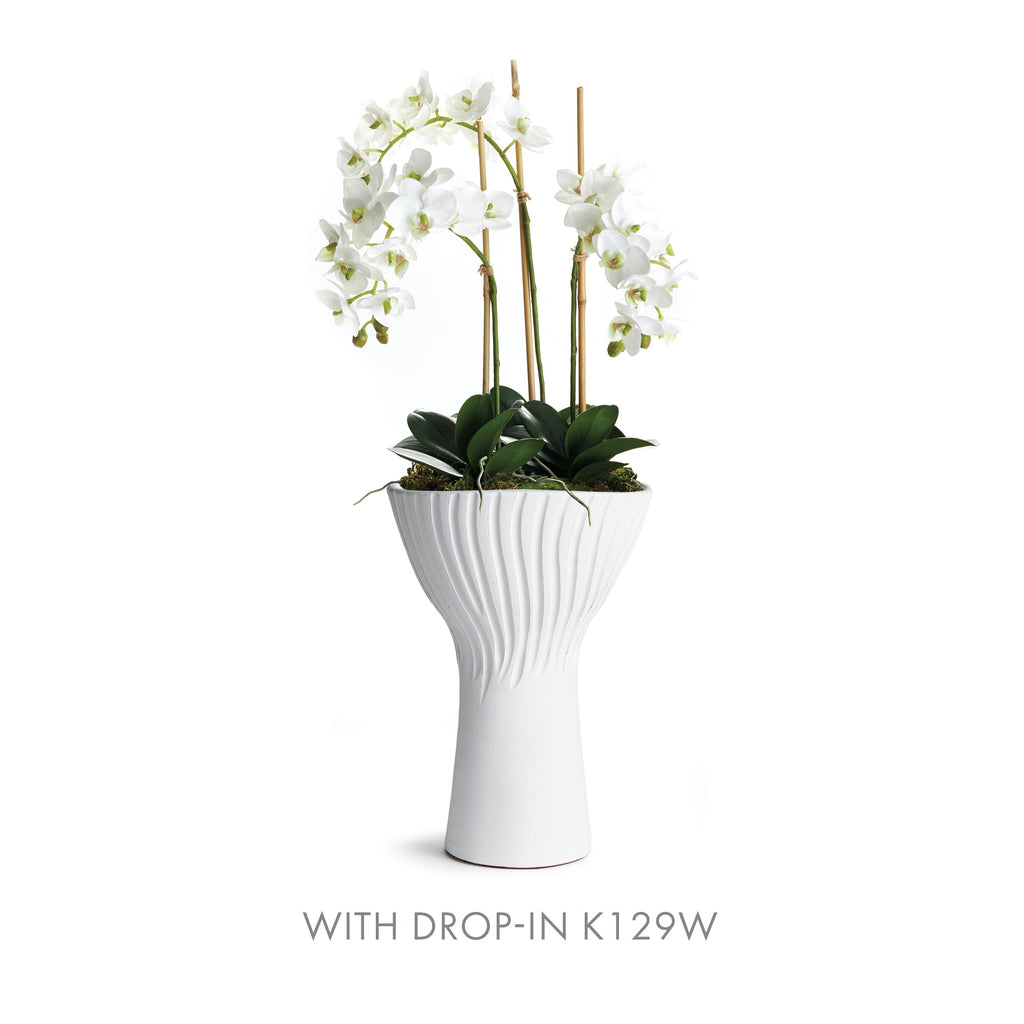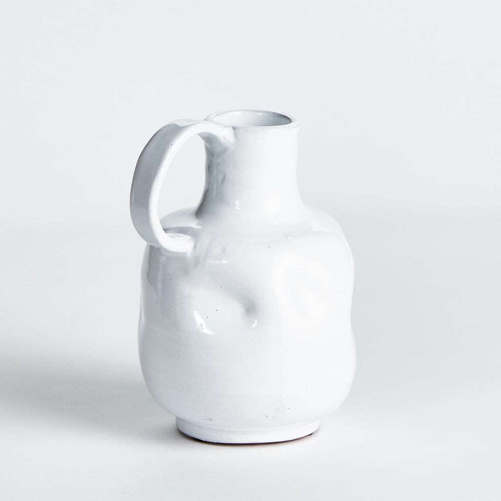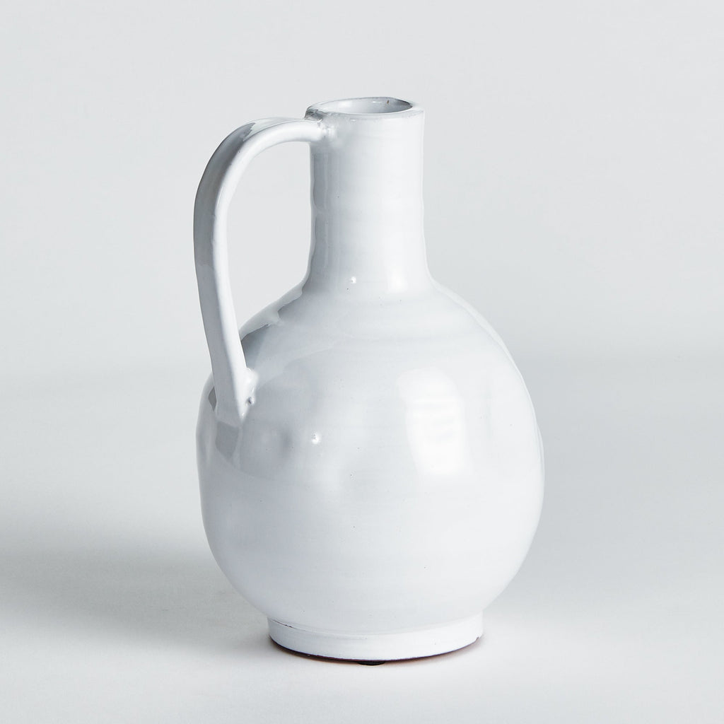 Each vase is designed to be a unique statement piece, whether with an intentionally irregular shape and delicate handles or a fluted shape with a simple linear pattern. Finished in a crisp white glaze, these vases fit seamlessly into any well-designed space. Add some faux stems, or display simply as is for a clean look.