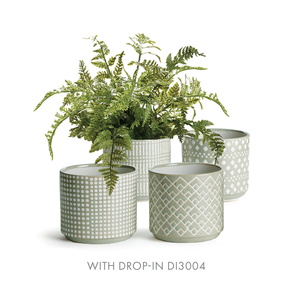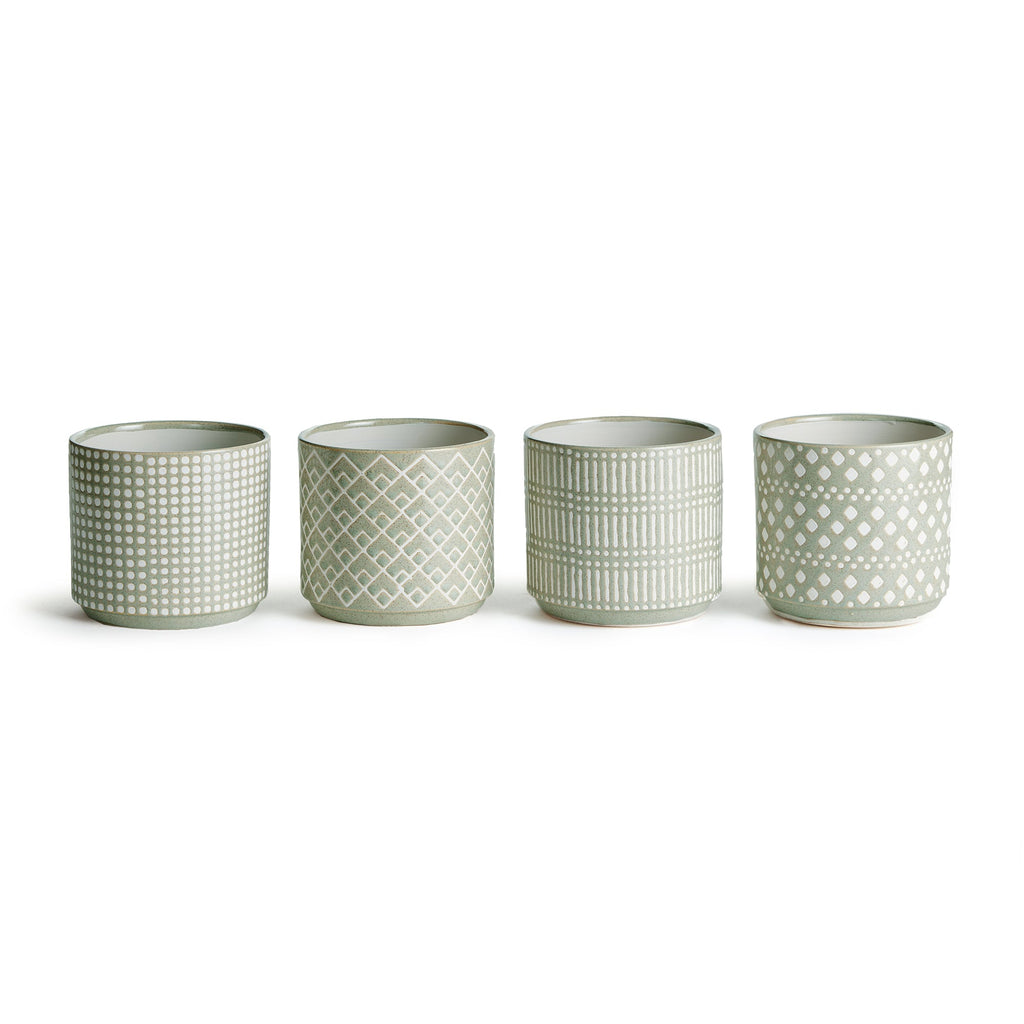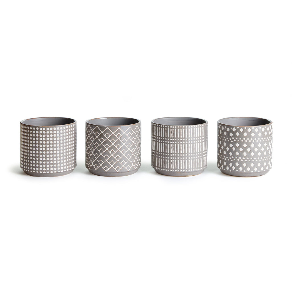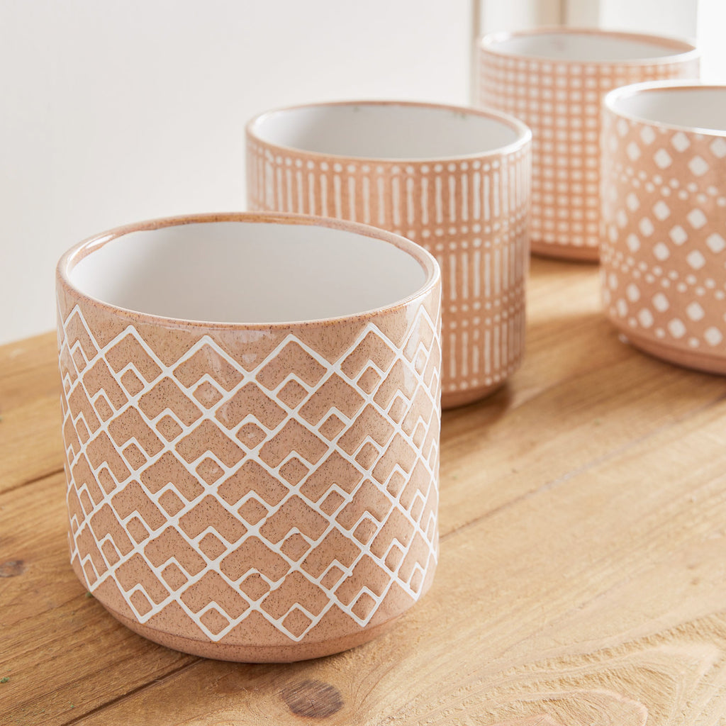 This set of pots in whimsical geometric patterns are fun to mix and match. A coordinating set of four, all in a high gloss glaze. A real fashion statement for your plants.