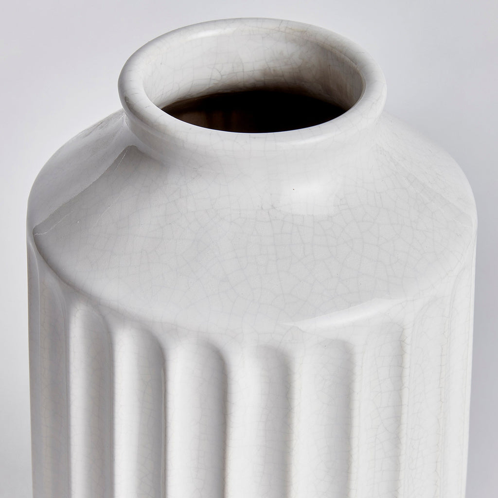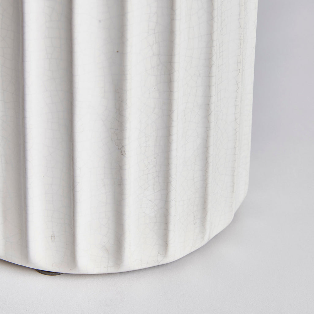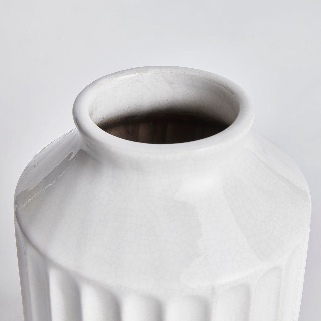 With a wide base and sculpted details, this durable stoneware vase is a classic accent. Finished in a crackle white glaze, it sits beautifully in a colorful bookshelf or mantle.