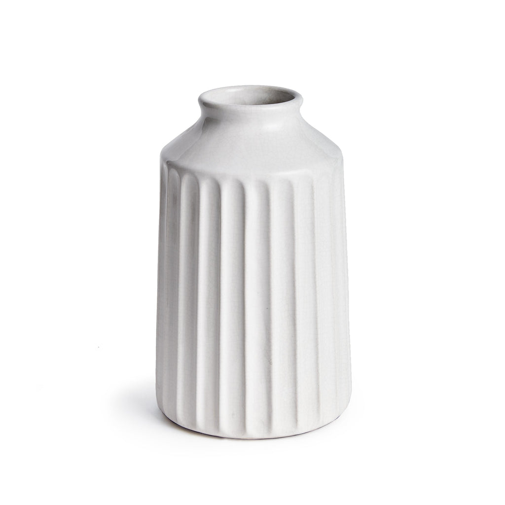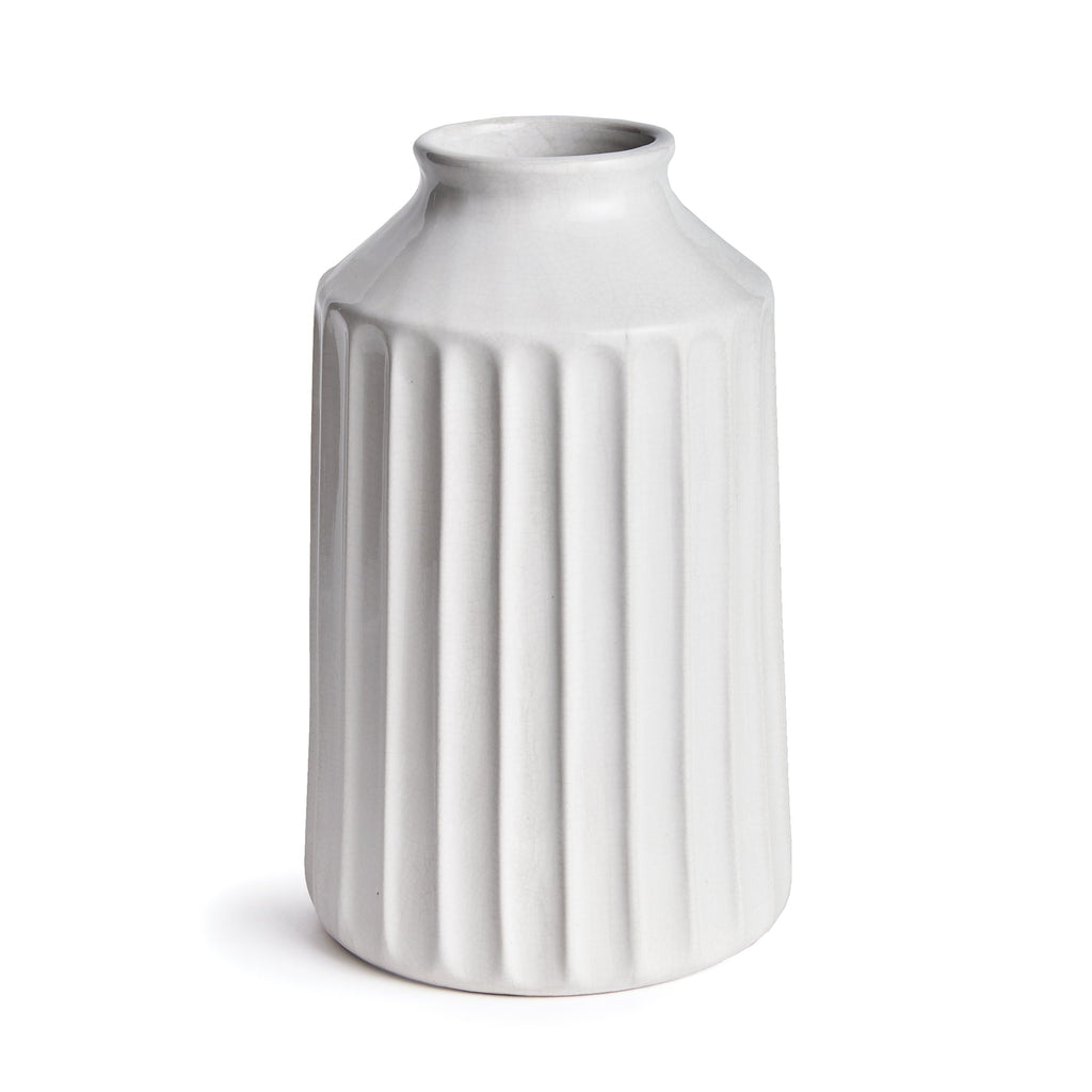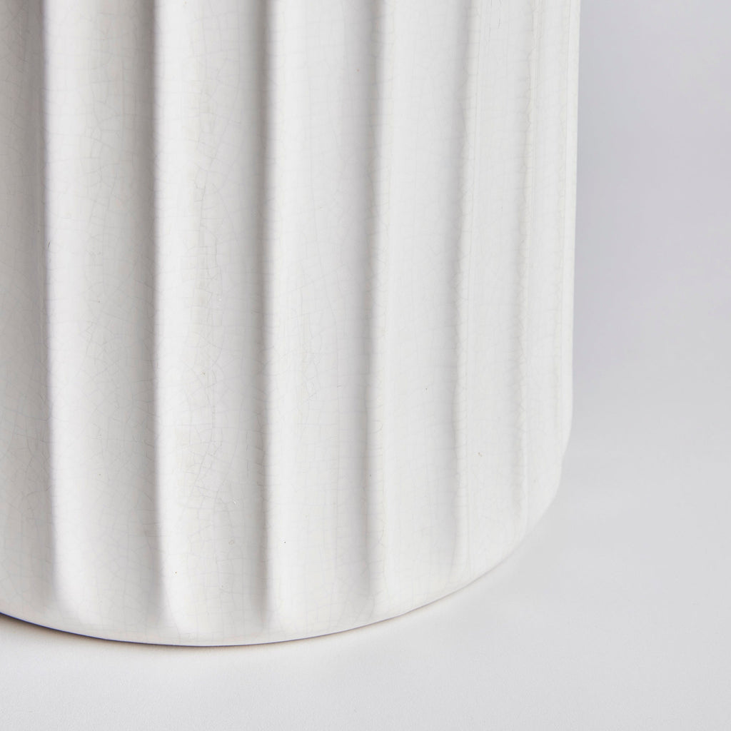 With a wide base and sculpted details, this durable stoneware vase is a classic accent. Finished in a crackle white glaze, it sits beautifully in a colorful bookshelf or mantle.