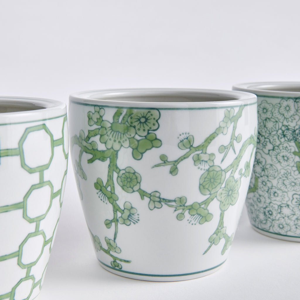 A classic chinoiserie in shades of green. How refreshing! The color green is known to have a harmonizing, balancing effect, so is an inspired design choice for the coordinating Imperial Mini Pots. A welcome addition, bringing stability and calm to the well-appointed kitchen, study or covered porch.