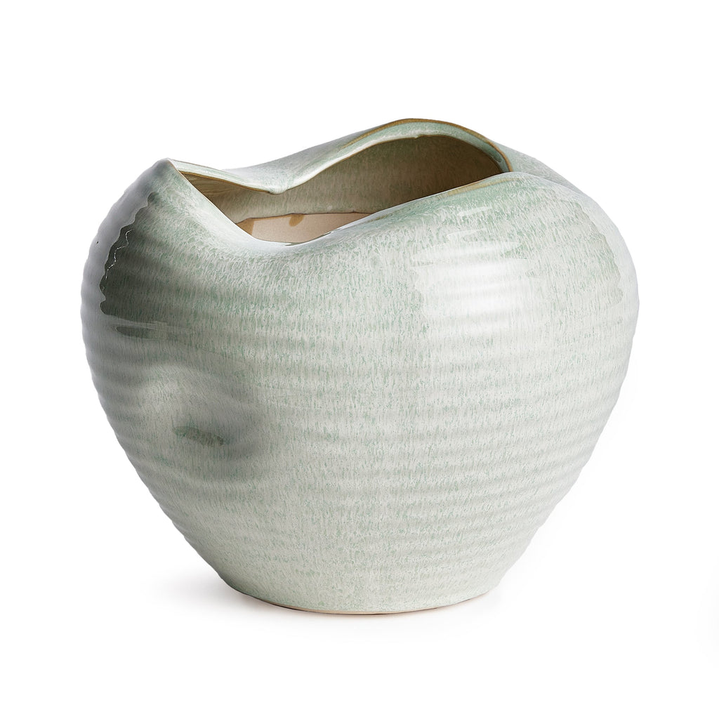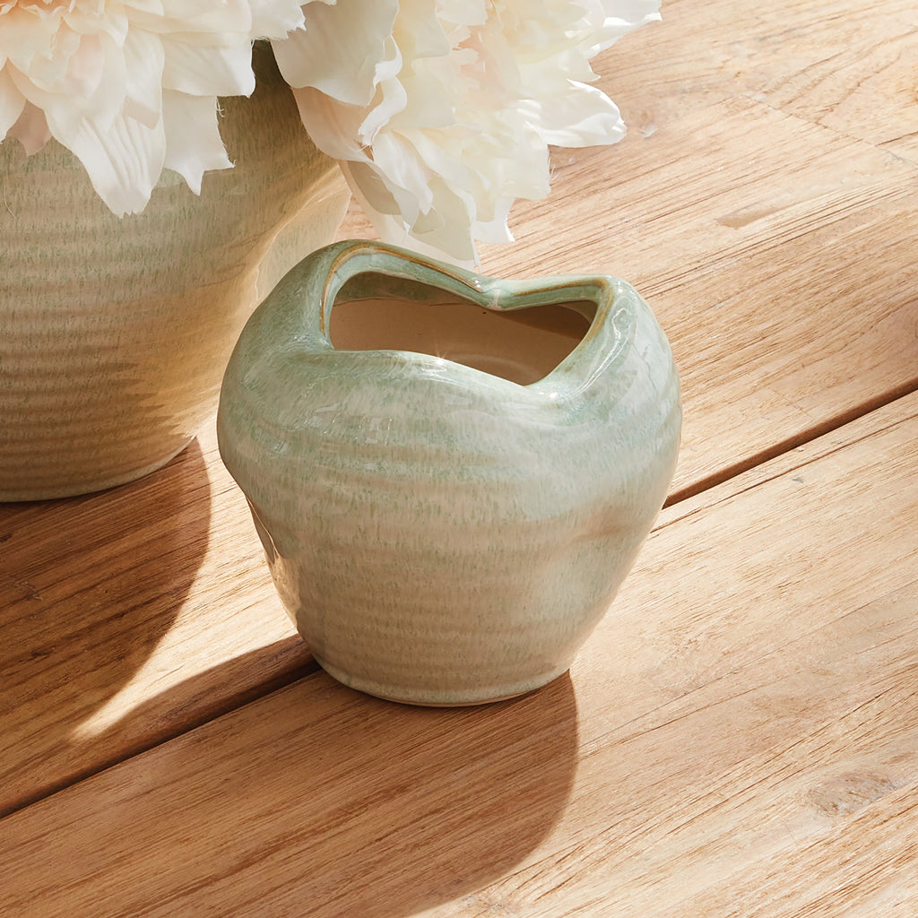 This utterly organically shaped vase is a one-of-a-kind treasure. With its unique shape and stunningly sage reactive glaze, it is just the objet for that special spot on your desk or in a bookshelf. Add some short stems for a bit more color.