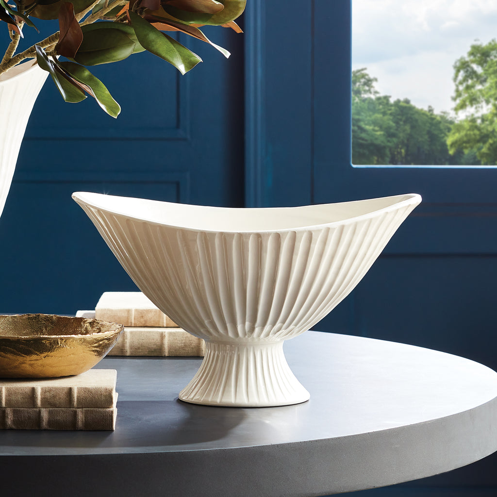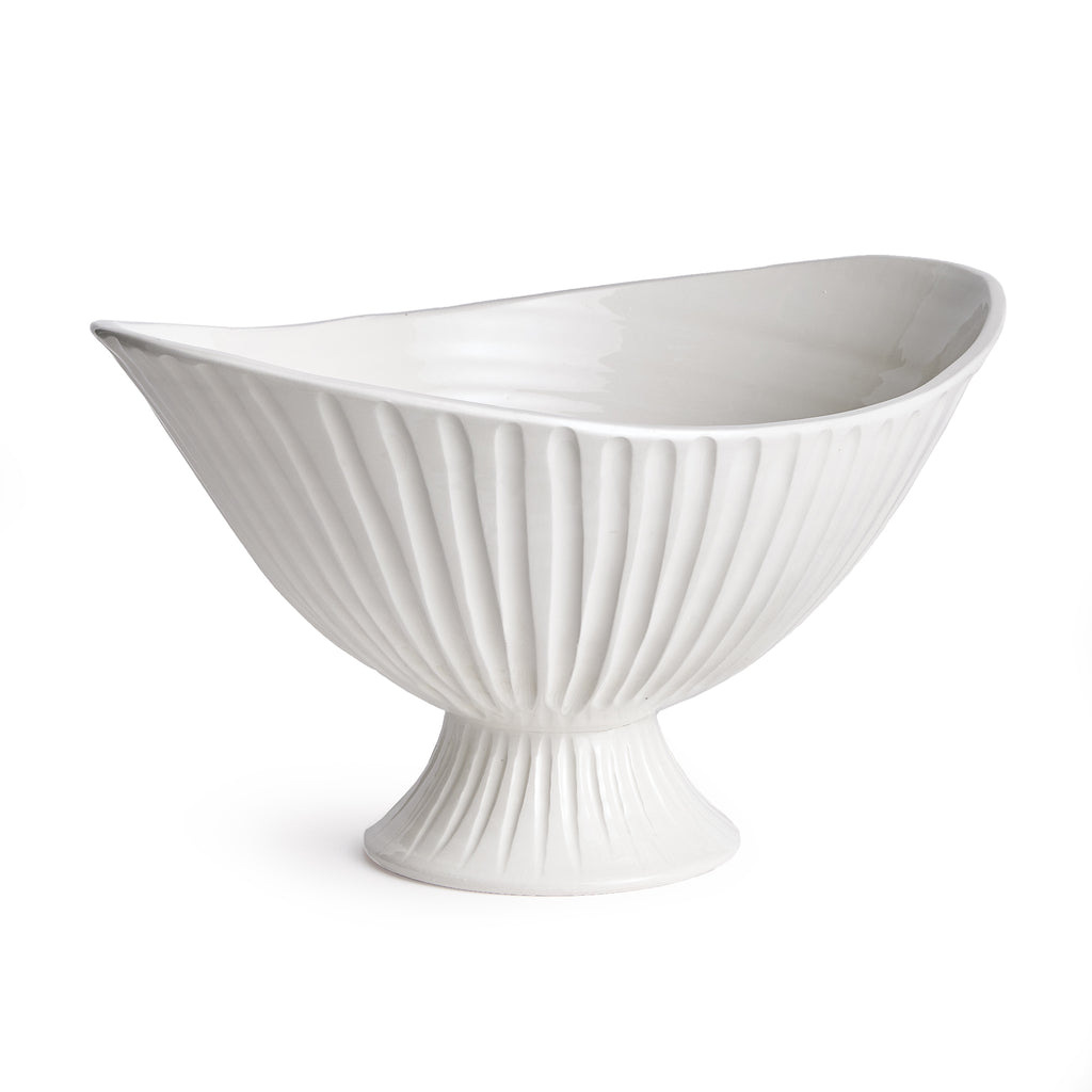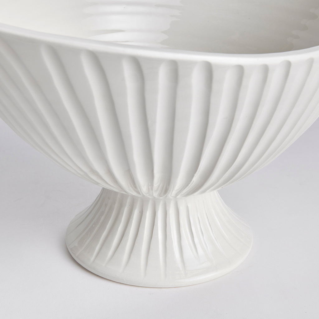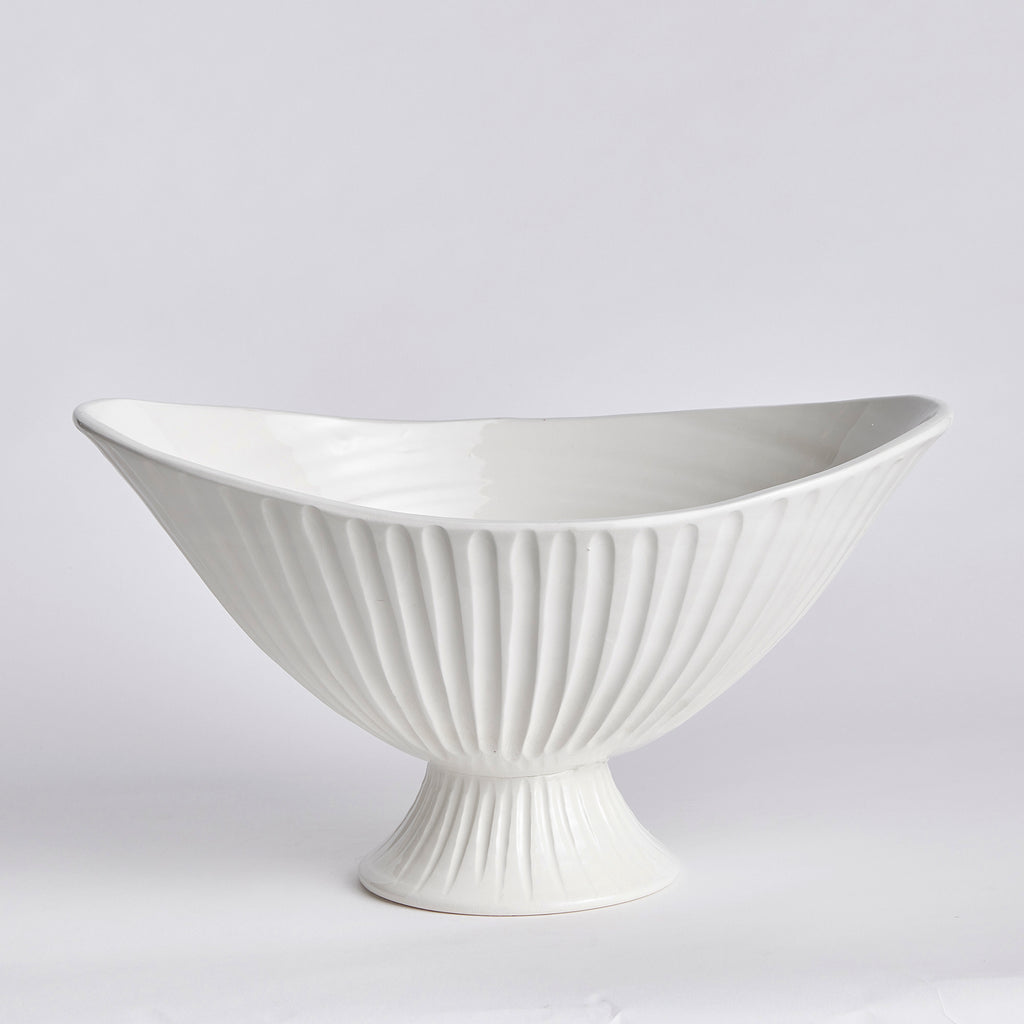The Palermo Footed Bowl is handmade by Italian artisans in Tuscany, Italy. With a classic Italian craftsmanship passed down through generations, each piece is a true original. A nicely poised shape, hand formed rim and fluting, this oval beauty is designed in grand scale. A real masterpiece for feature table, kitchen island or mantel.