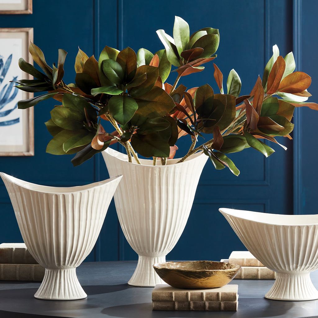 These white ceramic masterpieces are designed to be the focal point of any space, whether it's a feature table, kitchen island, or mantel. Each piece boasts a unique form, with hand-formed details that are sculptural and elegant, embodying a sense of movement and grandeur.