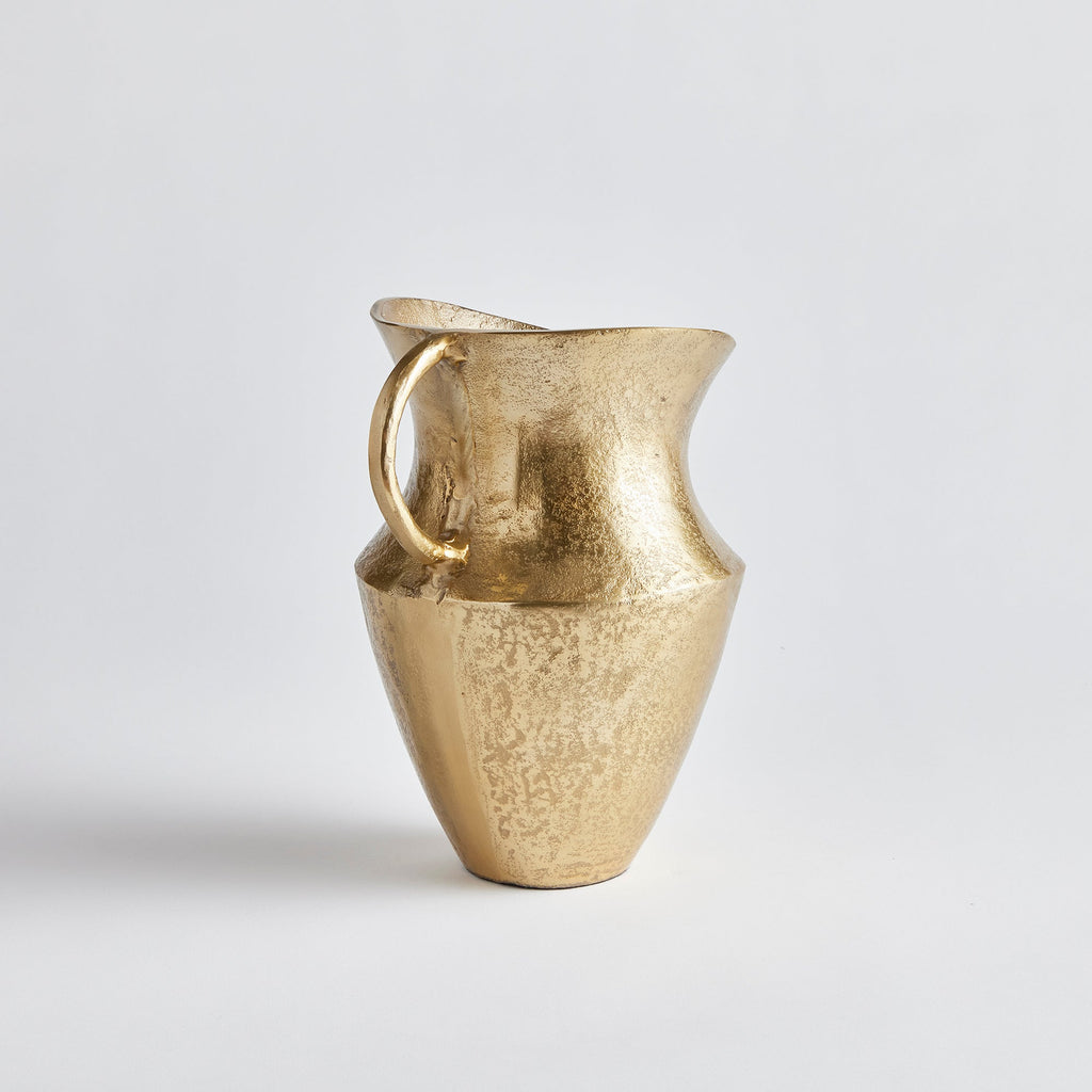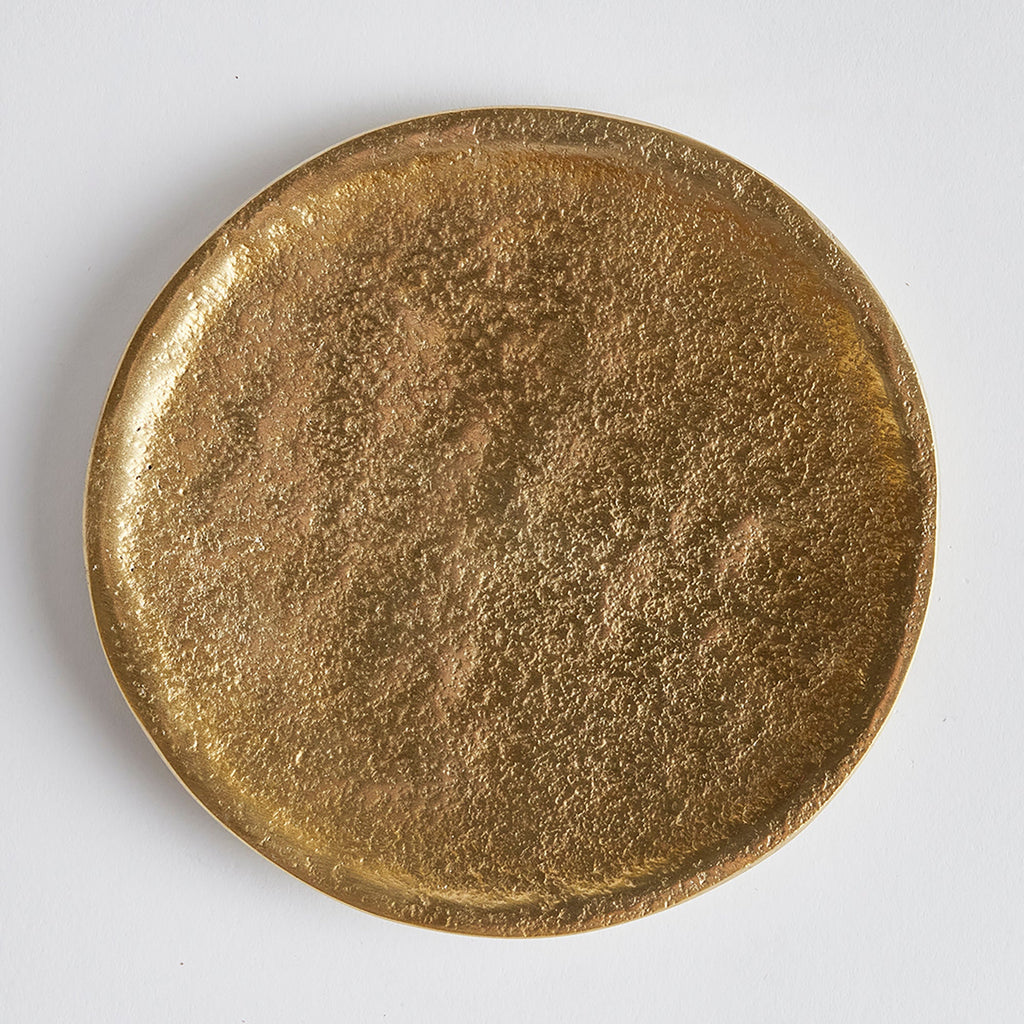 The products feature contemporary designs crafted from cast aluminum, finished in a warm gold with a rich texture. These items are intended for interior use only and should be dusted with a soft cloth to maintain their appearance. Avoid using harsh chemicals for cleaning.