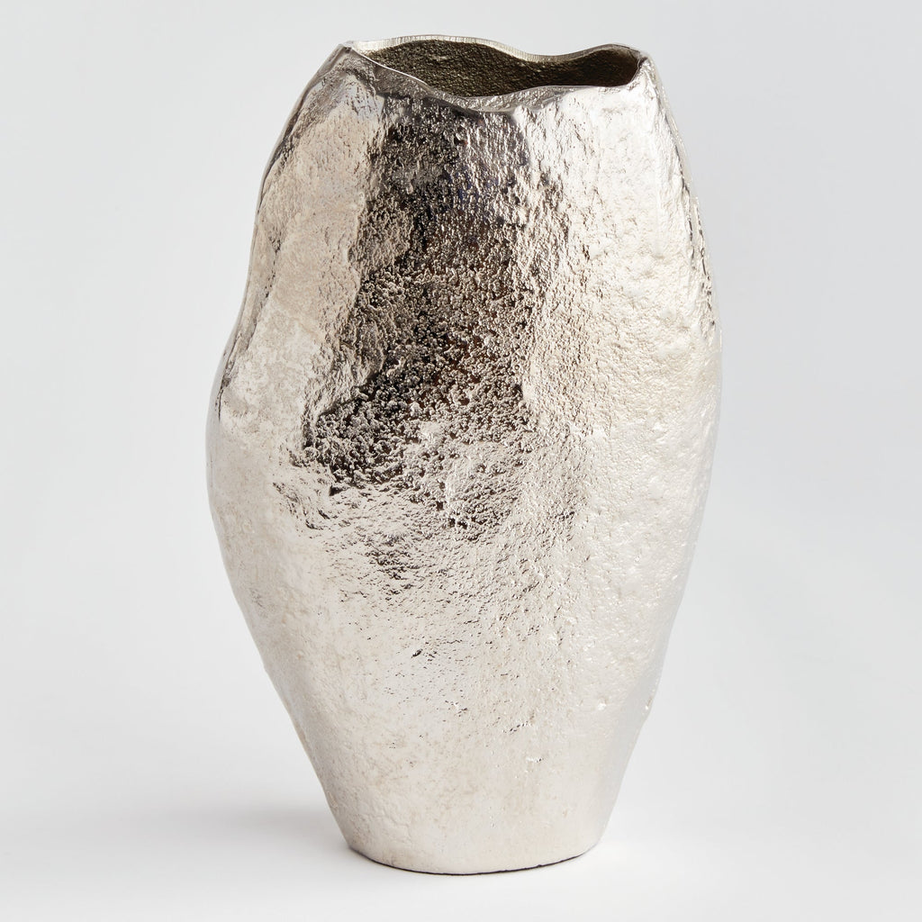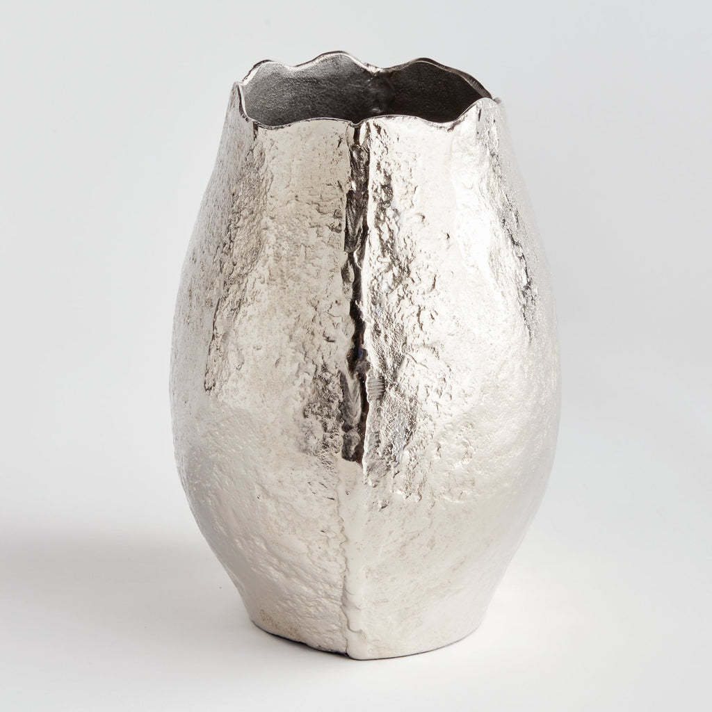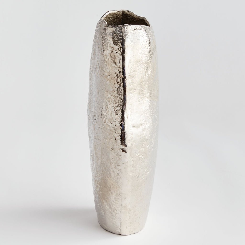 This organic vessel was made to celebrate the textural qualities inherent in sand cast aluminum. With a narrow, oblong profile and contemporary shape, it is perfect for the narrow shelf or modern mantel.