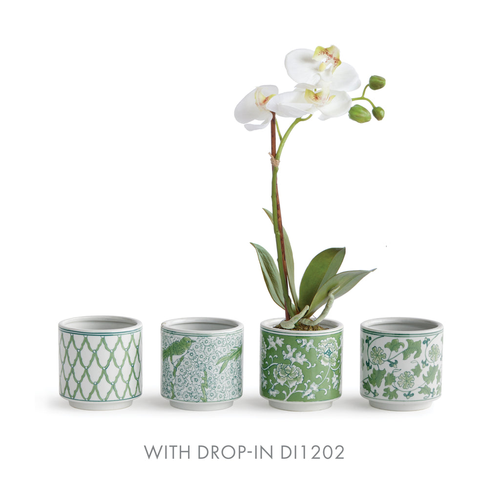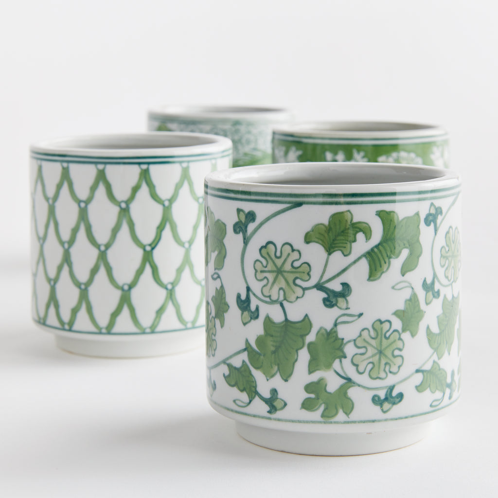 A classic chinoiserie set in shades of green. How refreshing! The color green is known to have a harmonizing, balancing effect, and is an inspired design choice for these coordinating mini pots. A welcome addition, bringing stability and calm to the well-appointed kitchen, study or covered porch.