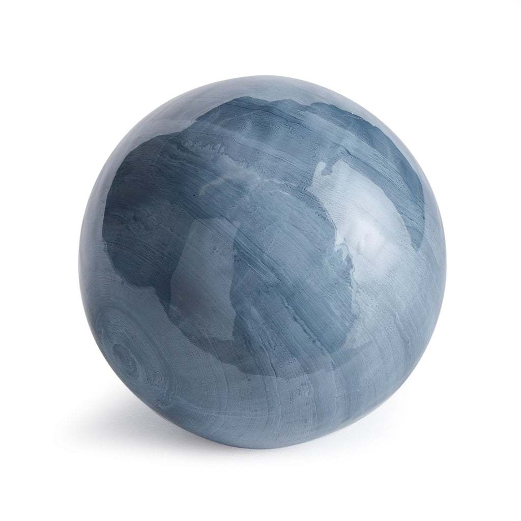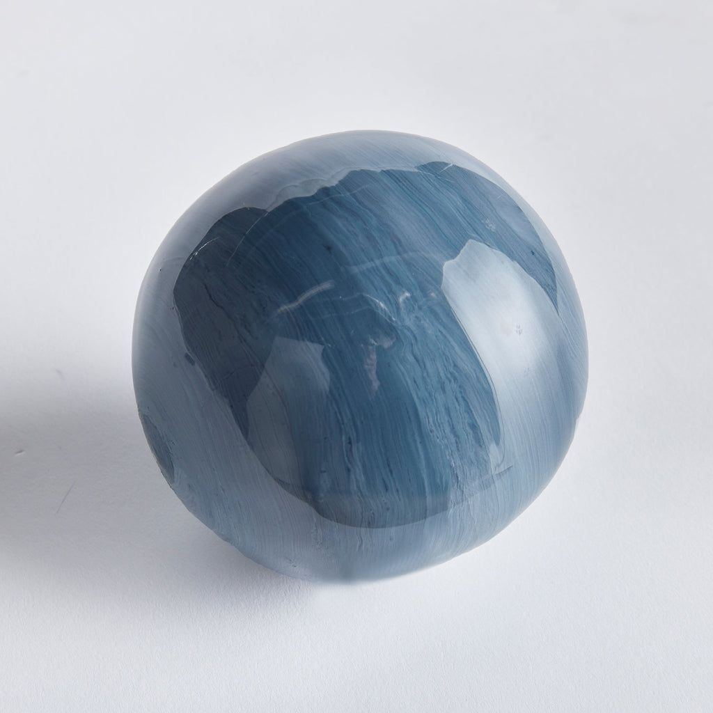 In a clever use of enameled iron, this lightweight orb is painted by hand. It features a refined, horizontal swirl design, with each piece displaying layers of delicate strokes in a coastal-inspired blue gray palette, exemplifying modern artistry.