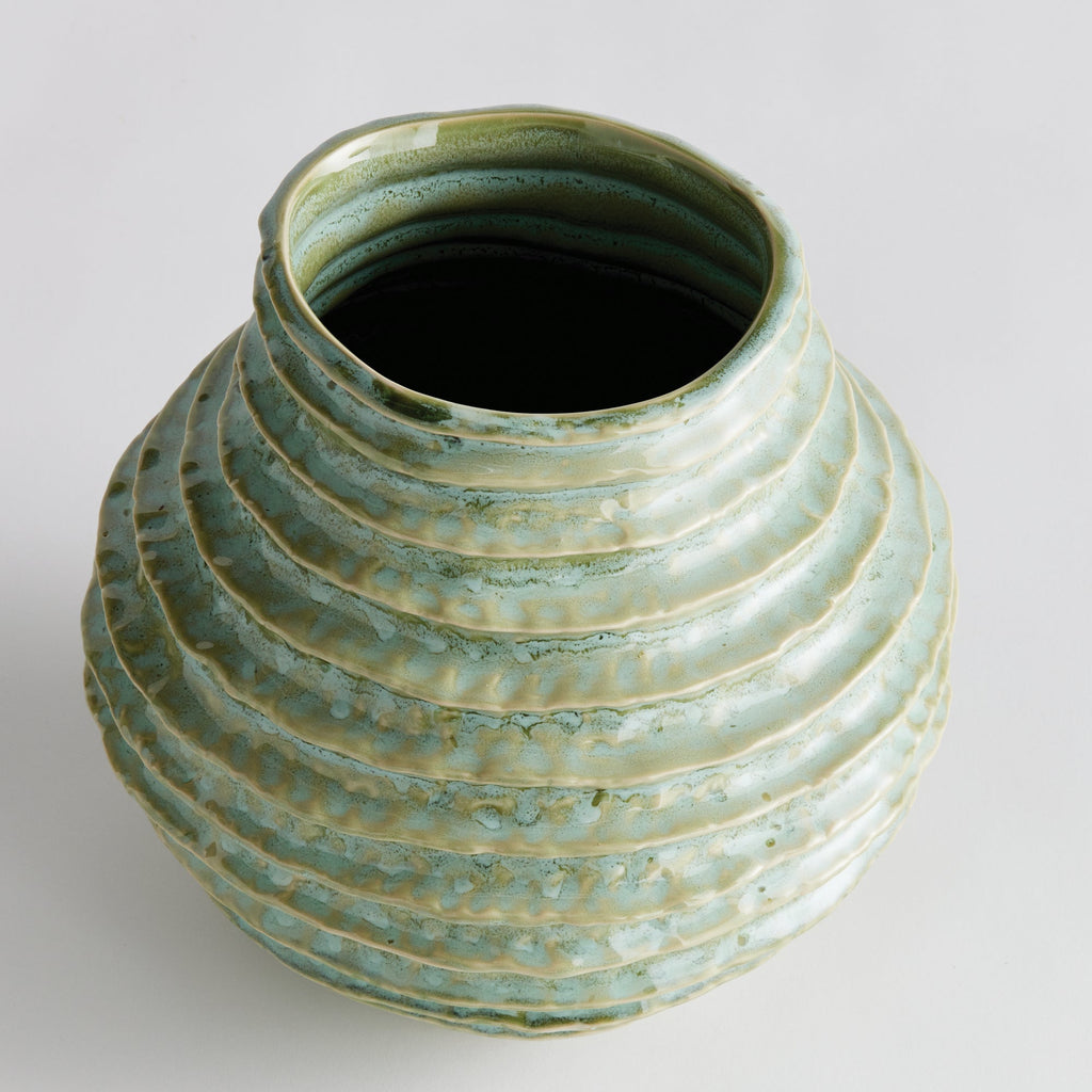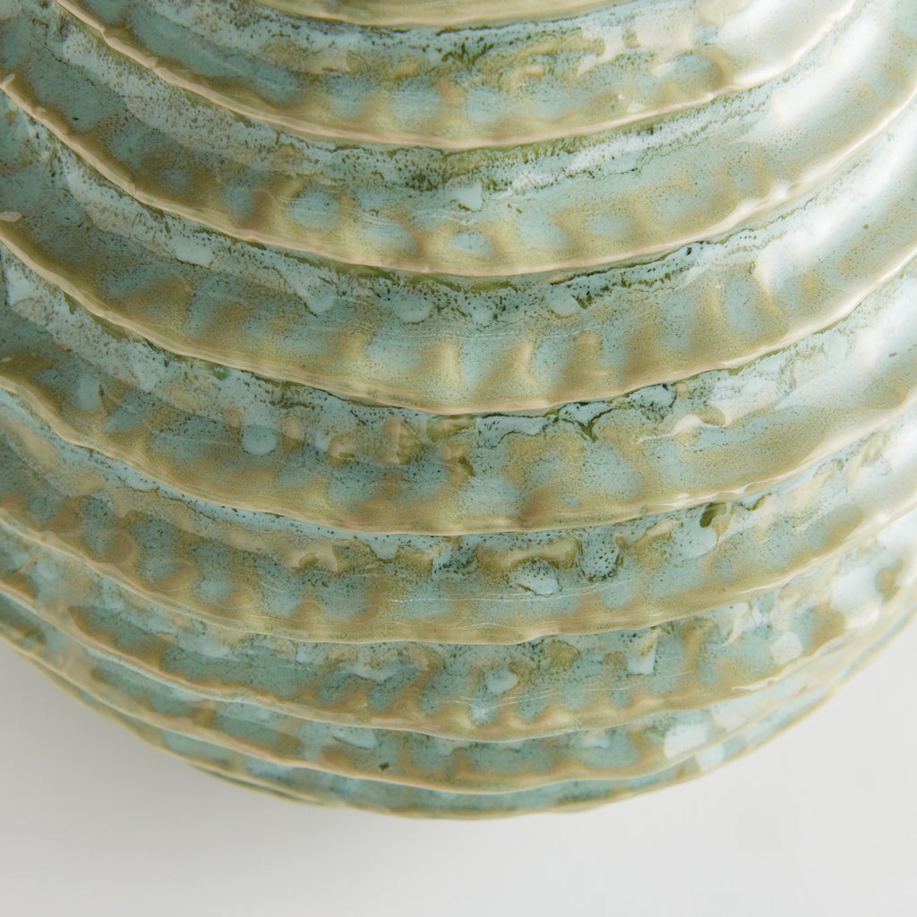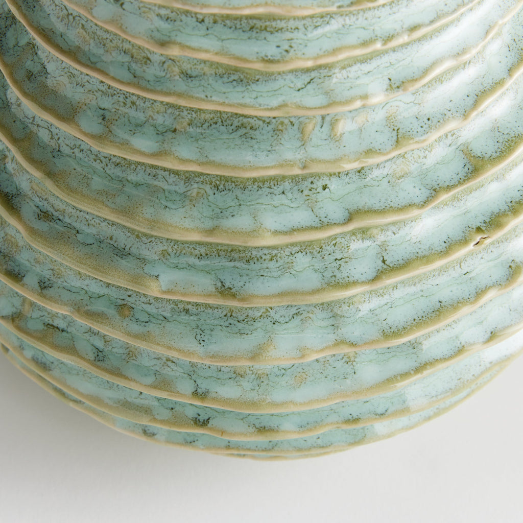 With a reactive glaze and hand finished ribbing detail, this charming vase is a great find. Add a few faux stems or display as is for a simplified look.