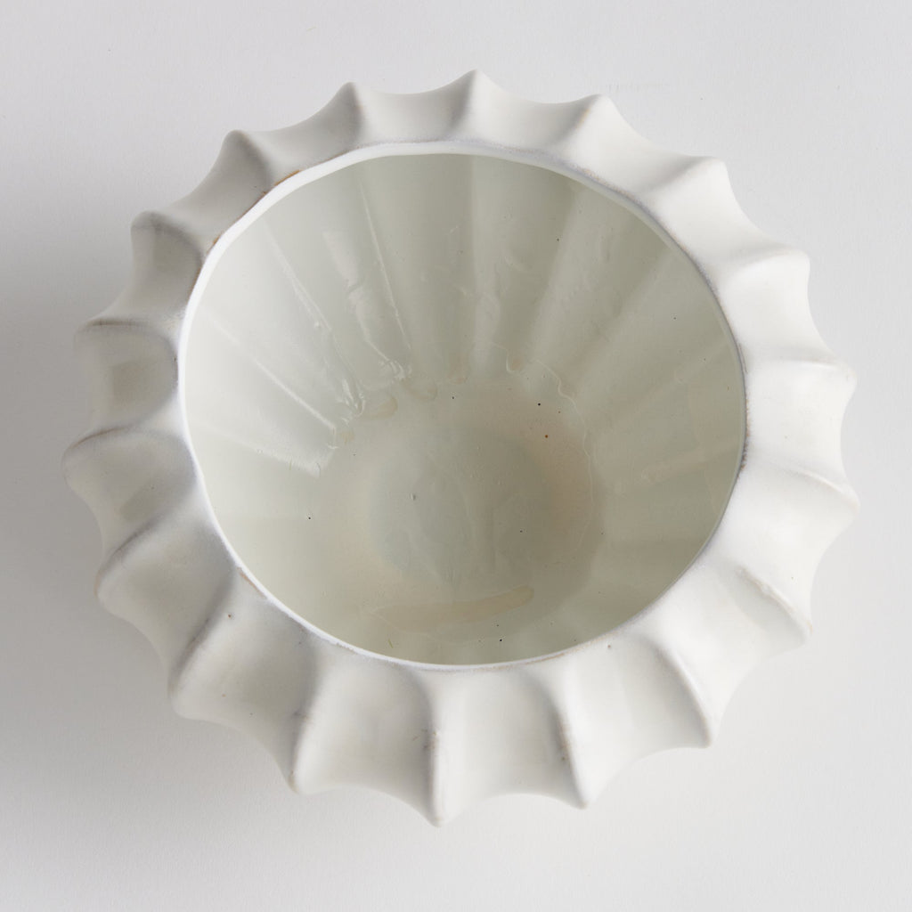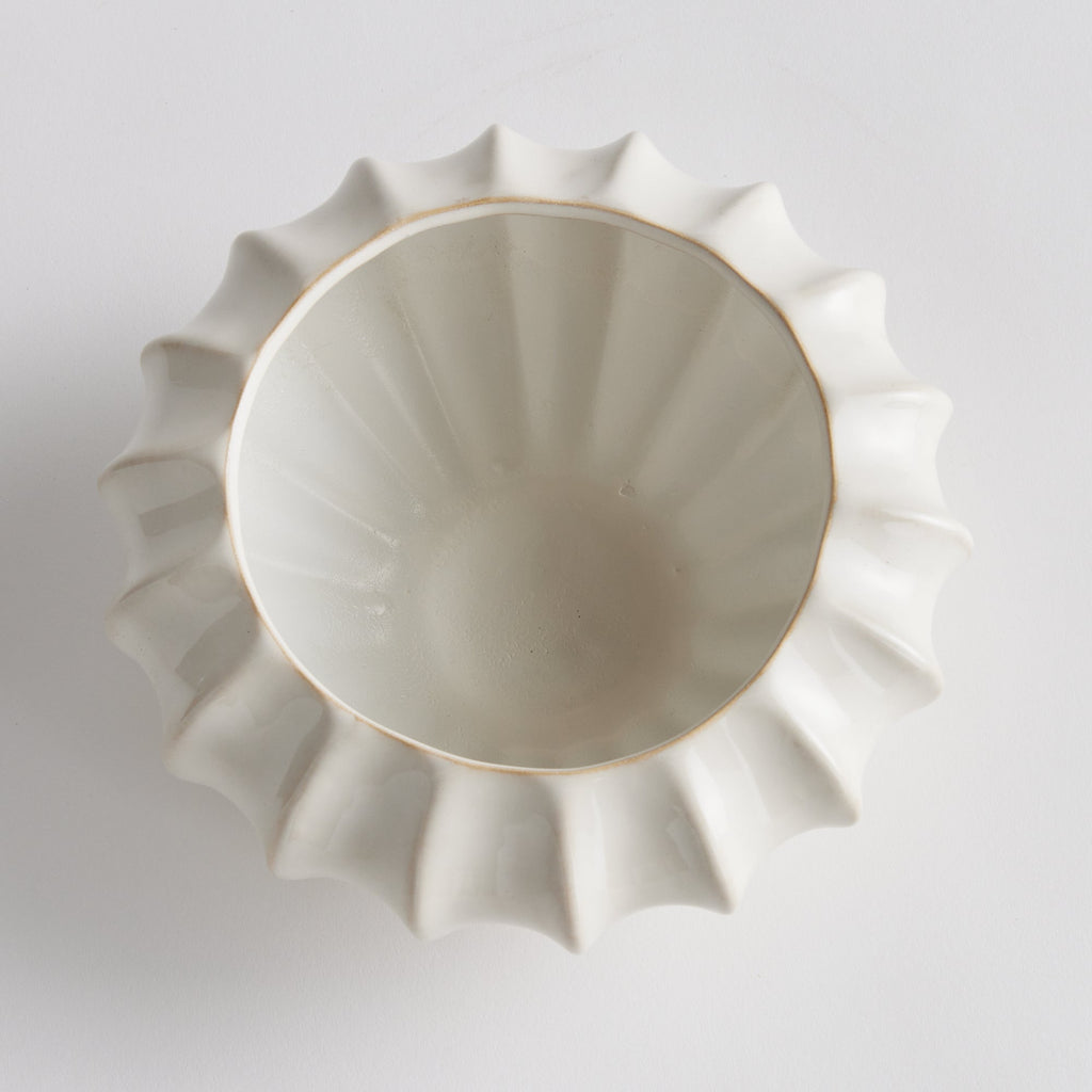 With a sculpted body and thickly applied glaze, this coastal-inspired low bowl is a work of art. The hand-finished details give it an artisan's touch. Add some textured orbs, a faux drop-in orchid or display as is. Simply gorgeous.