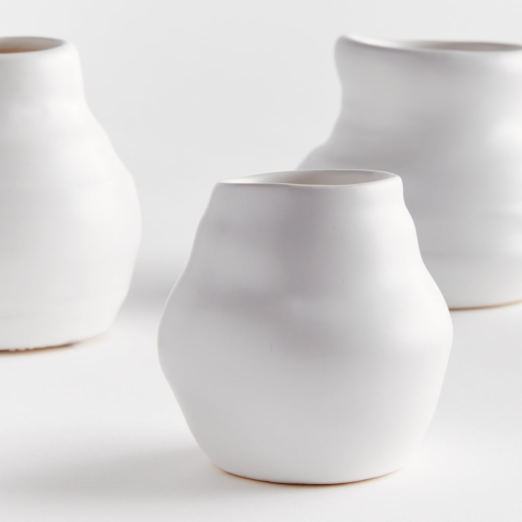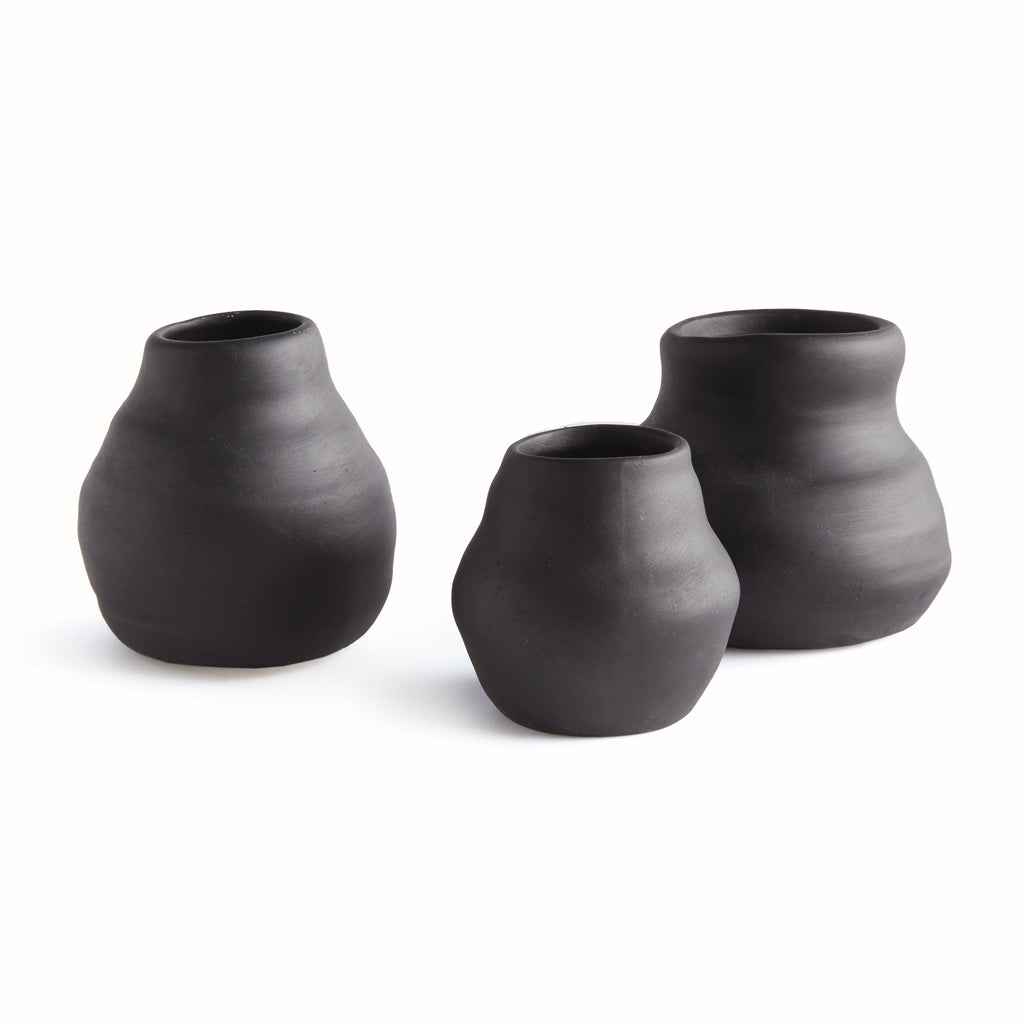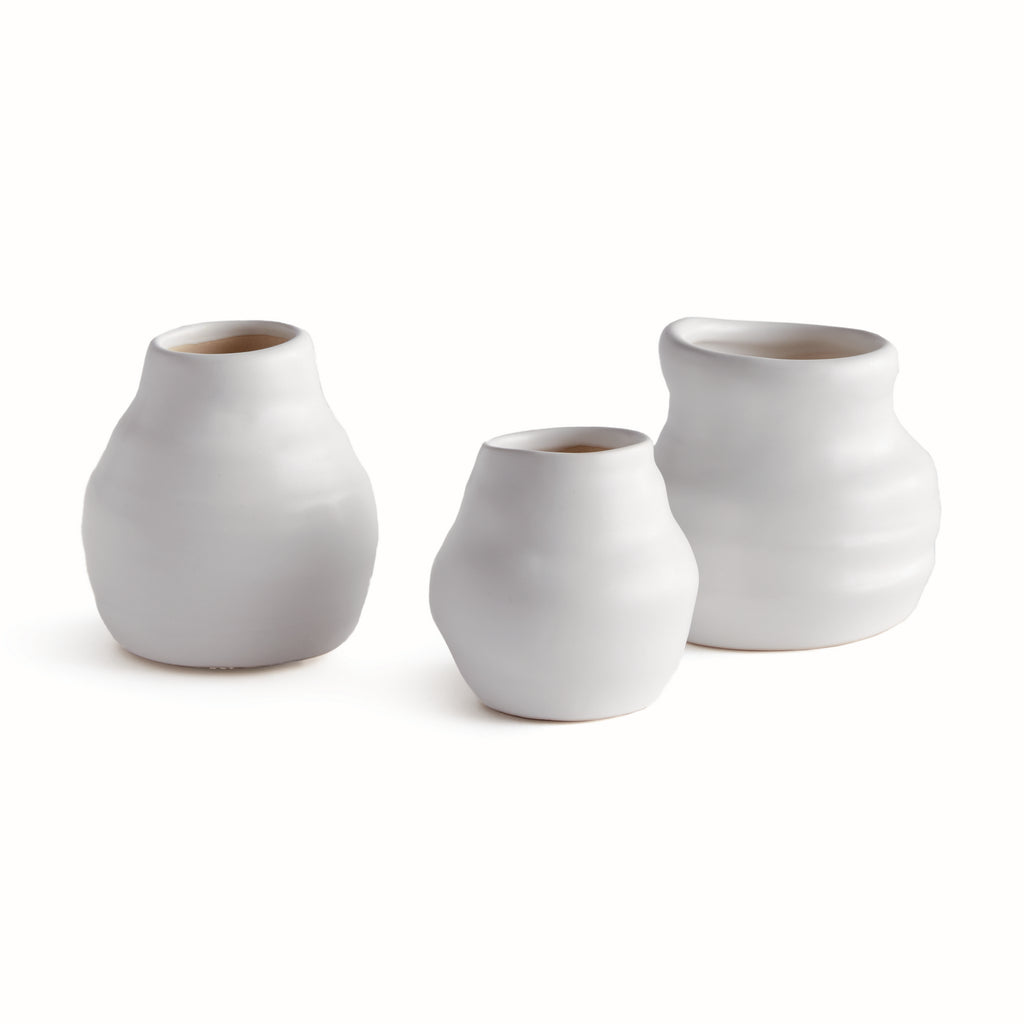 Handcrafted by skilled artisans, each piece is an original and varies in size and color. These three bud vases feature a simple and raw design, freshly made and direct from the hands of the artist to you. Add a little faux stem or display as is for a cleaner look. Dust with a dry cloth and protect fine furniture by lining the interior of the pottery when necessary. Decorative interior use only.