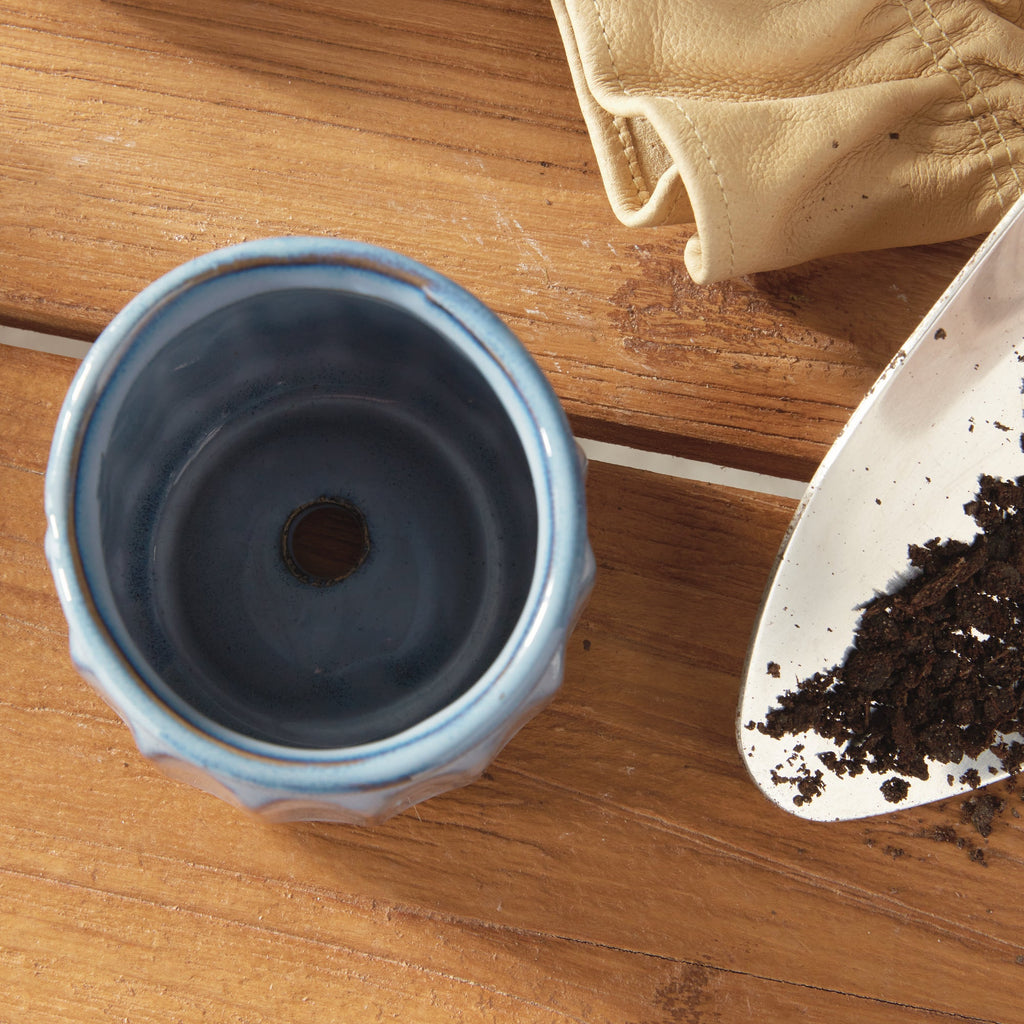 Use as cachepot or plant directly into. Protect fine furniture by lining interior of pot. Protect from frost and hard freeze.